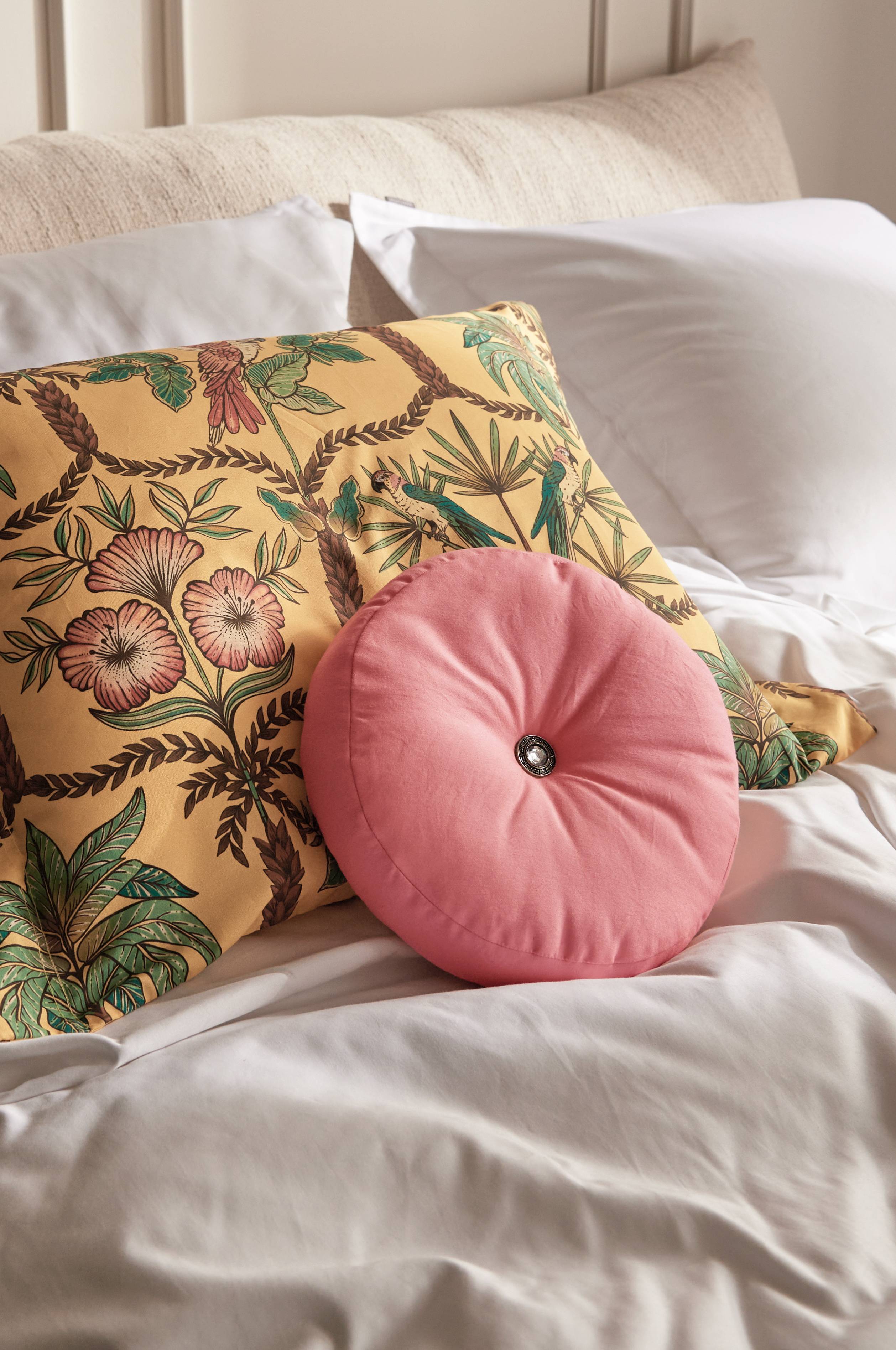 Rund pude med yderstof af bomuldssatin. Trådtæthed 800 tc. Diamantformet knap af plast i midten på forsiden. Fyld af silikoniserede hulfibre.