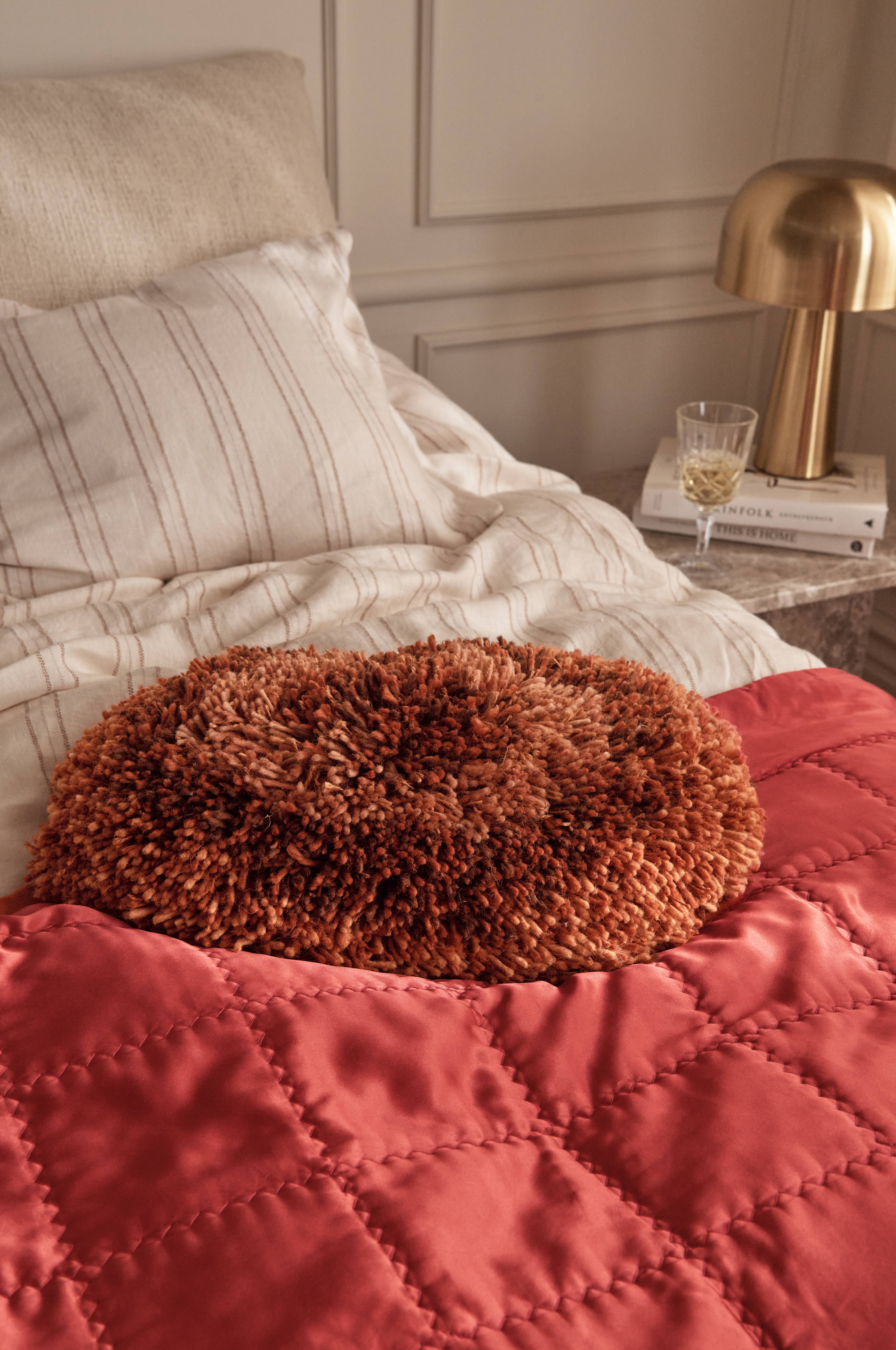 Pude med bund og bagside i bomuldskanvas. Håndknyttet forside med forskellige længder. Fyld af microfiber (850 g).
