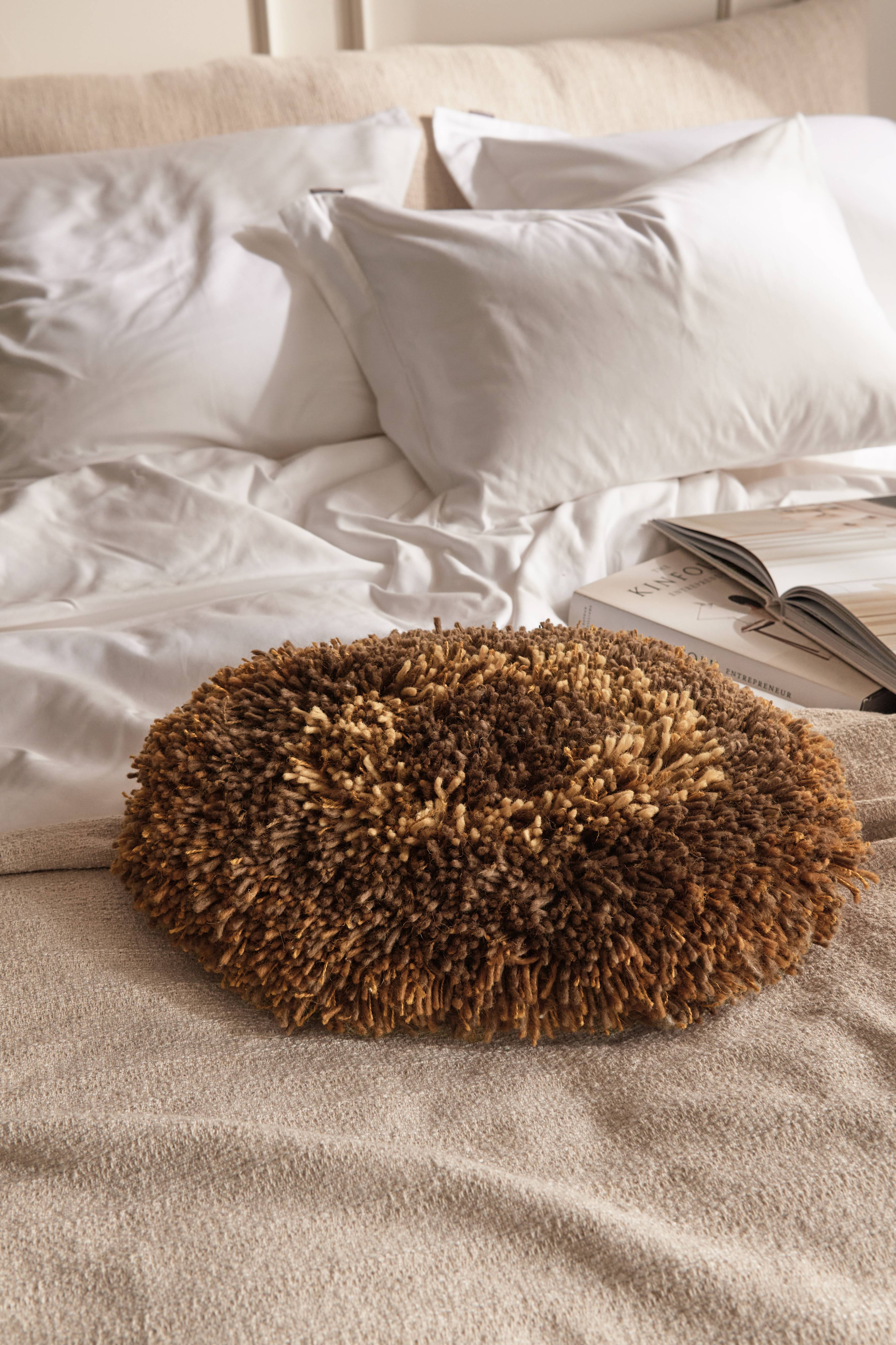 Pude med bund og bagside i bomuldskanvas. Håndknyttet forside med forskellige længder. Fyld af microfiber (850 g).