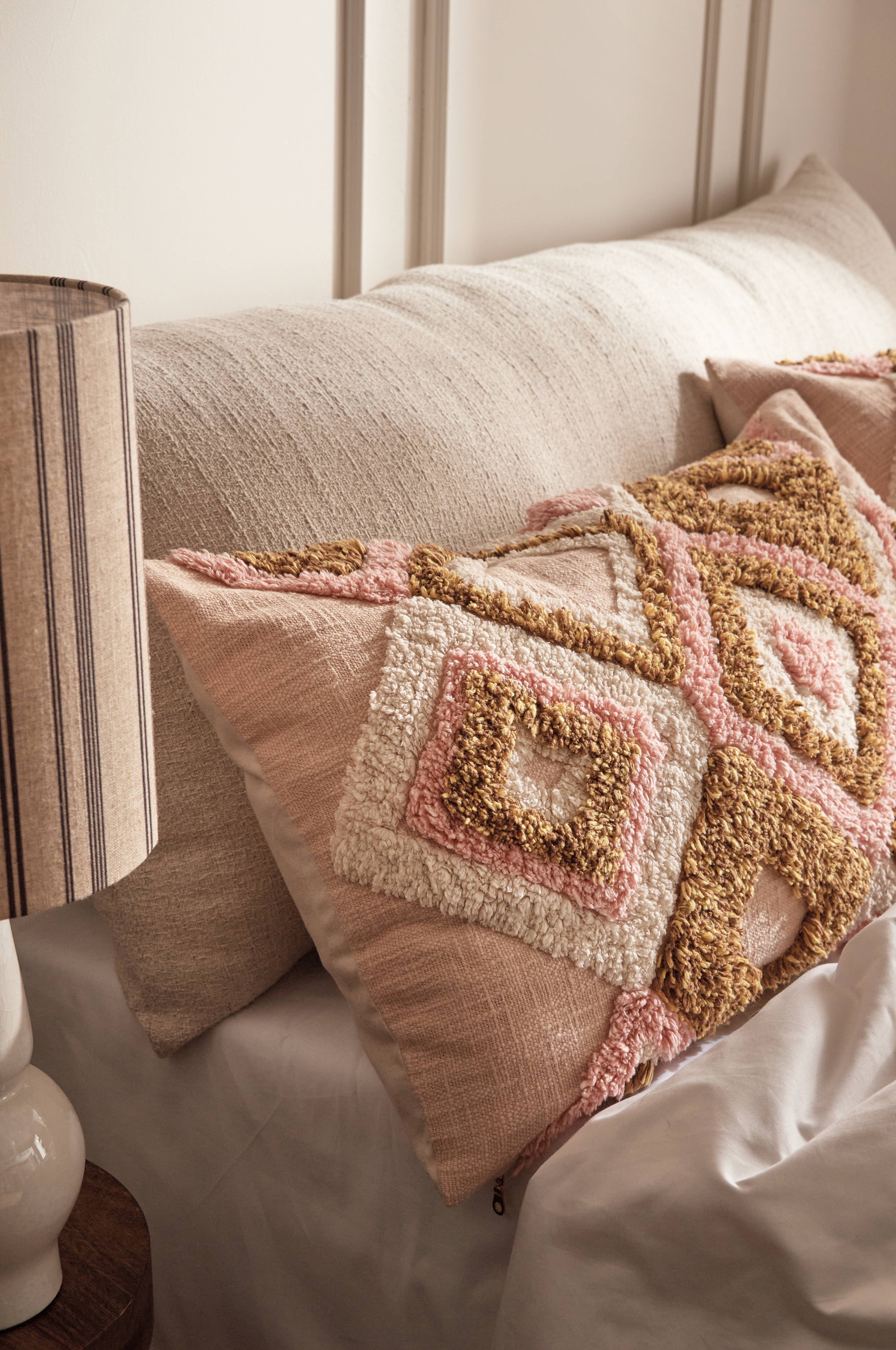 Pudebetræk i bomuld af en grovere kvalitet med tuftet mønster på forsiden. Ensfarvet bagside. Metallynlås.