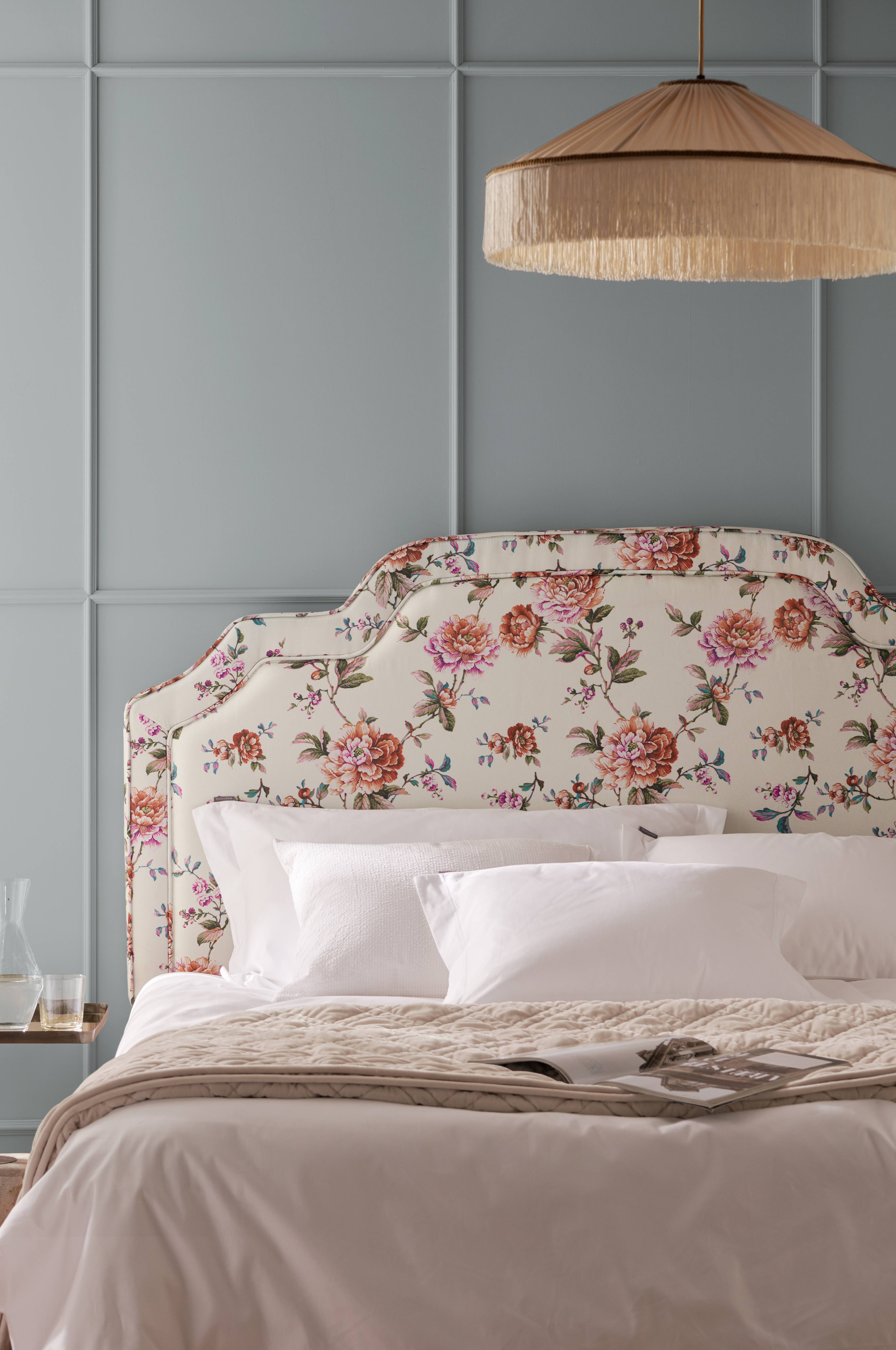 Vatteret sengegavl med ramme i massivt træ og plywood. Betræk i polyester med printet blomstermønster og en dekorativ paspoleret kant med samme print. Fyld af polyestervat. Til vægophængning.
