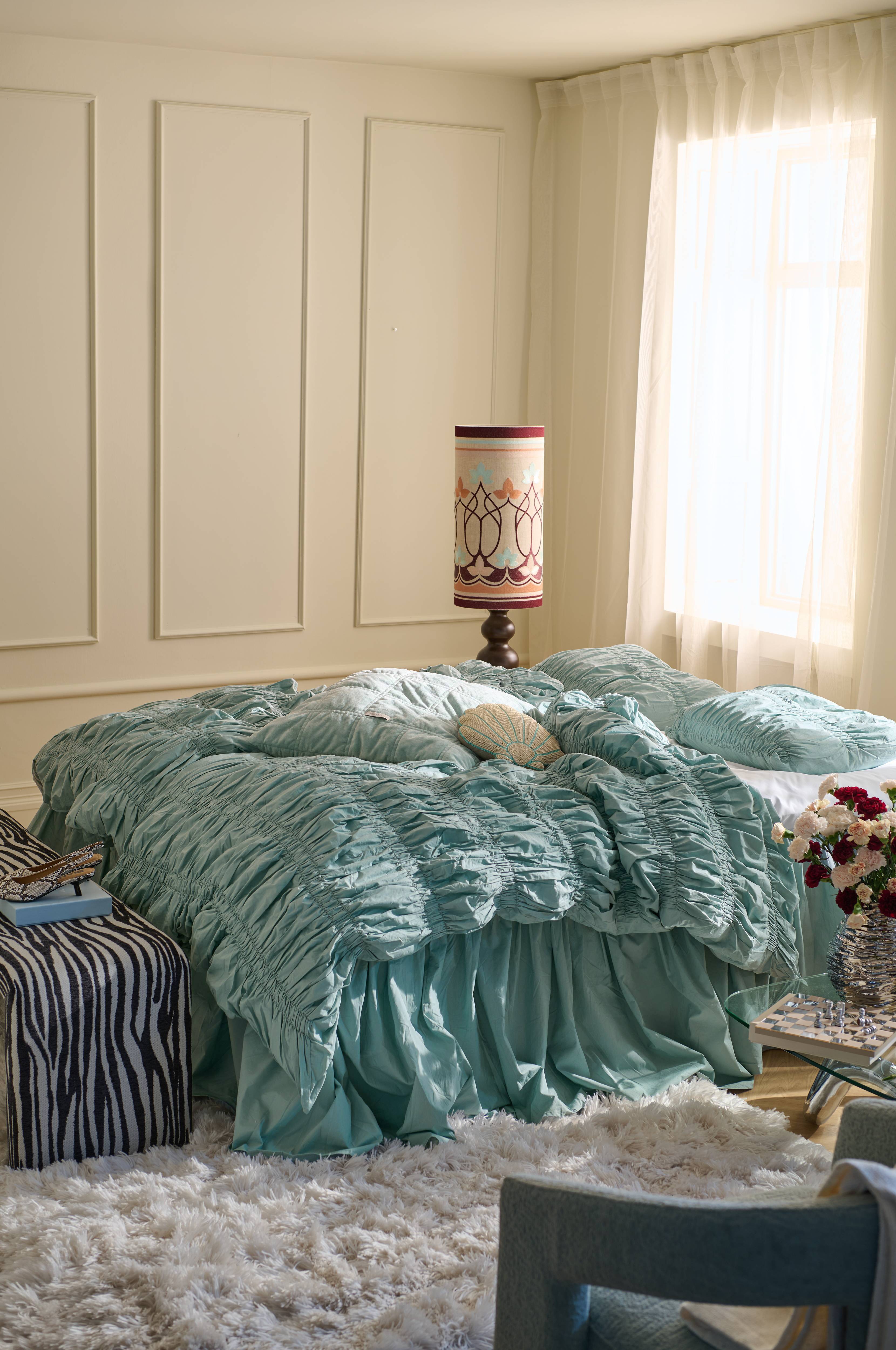 • Forsiden af dynebetrækket og pudebetrækket har en blød elastik, som giver en dekorativ effekt.