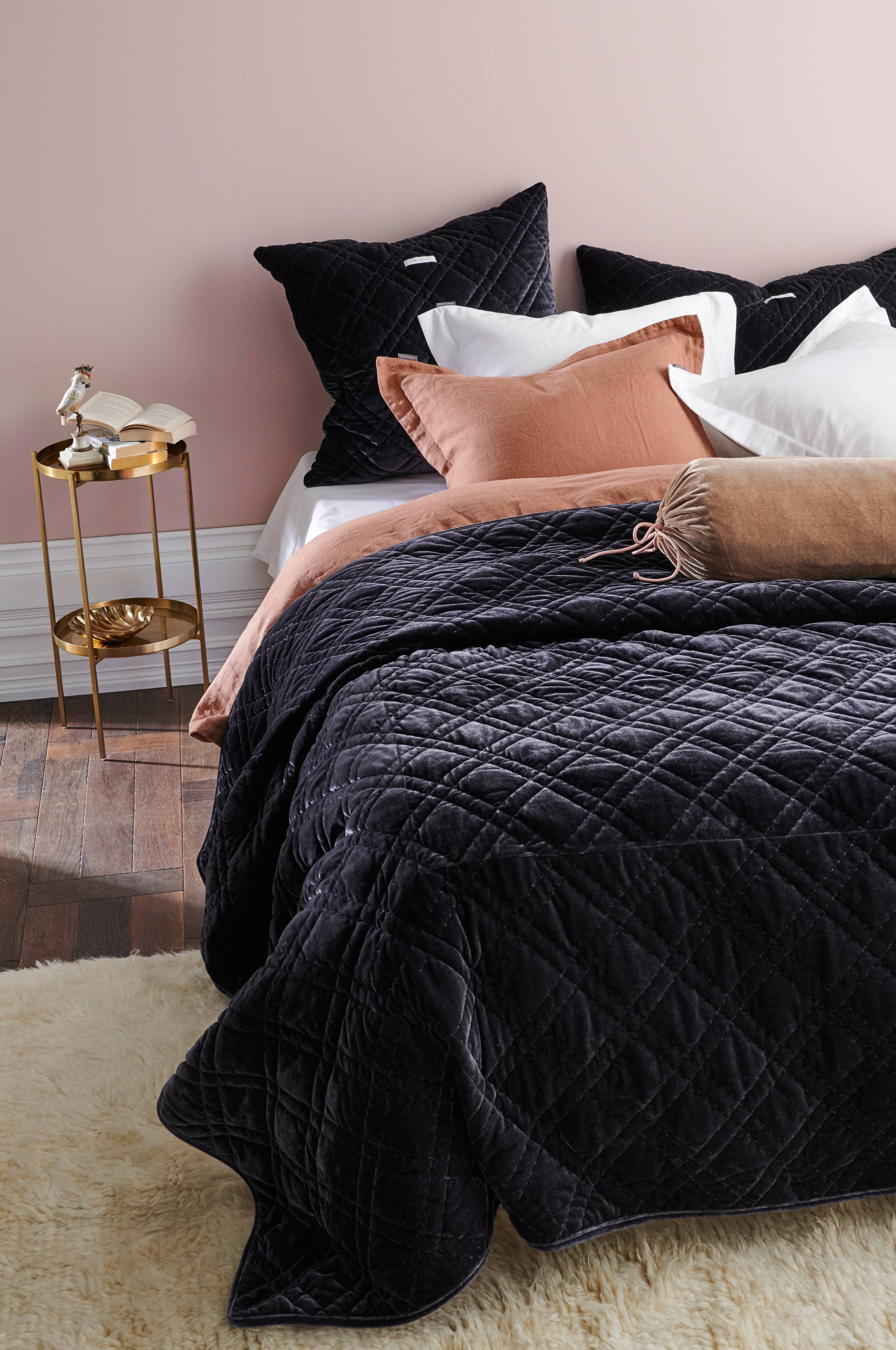 Quiltet sengetæppe med forside i nervøs velour med fin glans. Bagside af bomuld. Fyld af 120 g polyester.