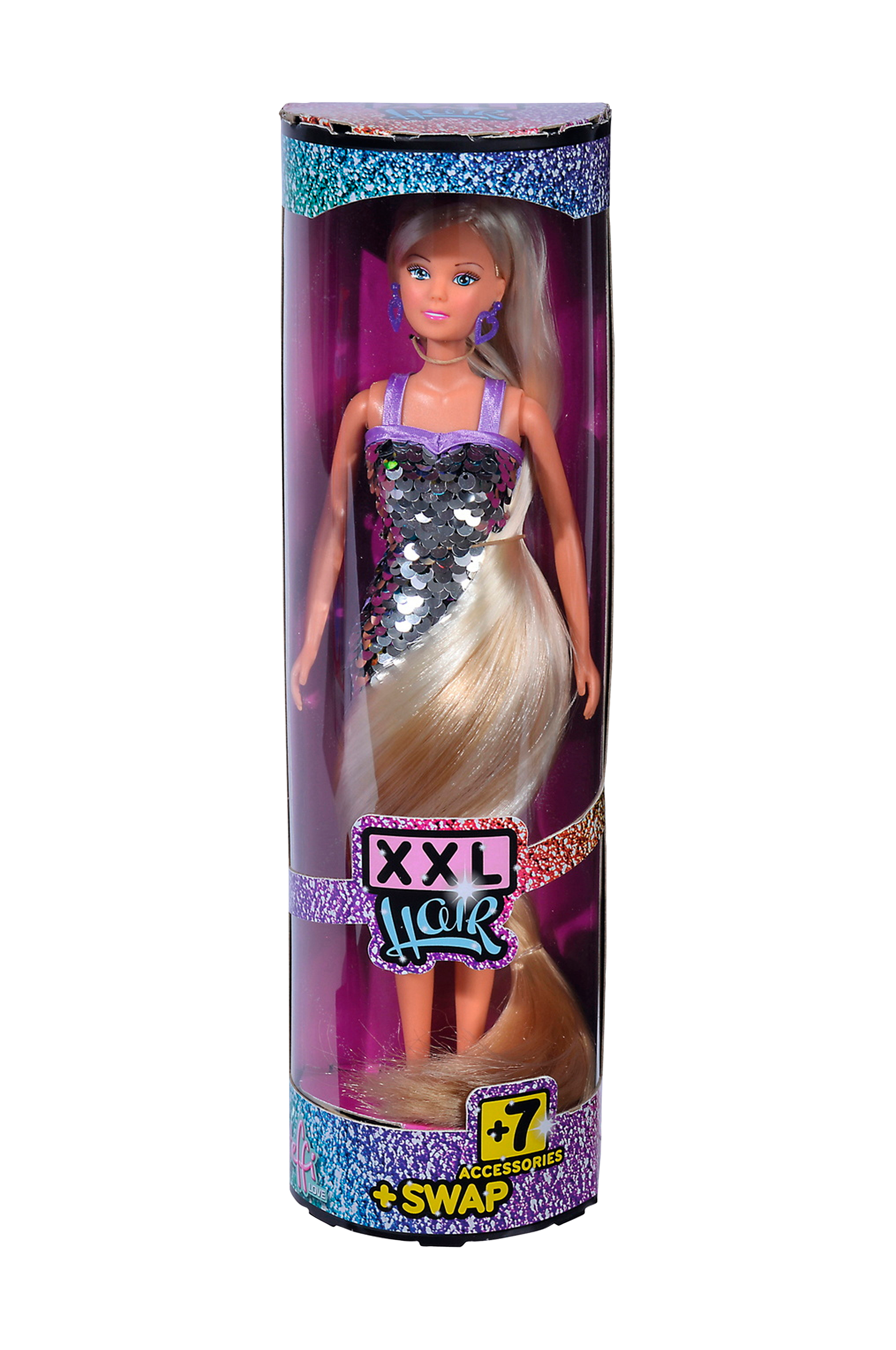 Sættet indeholder 6 forskellige hårspænder i flotte farver og en hårbørste i glitterdesign. Steffi er iført en pailletkjole kombineret med lilla kondisko og øreringe.