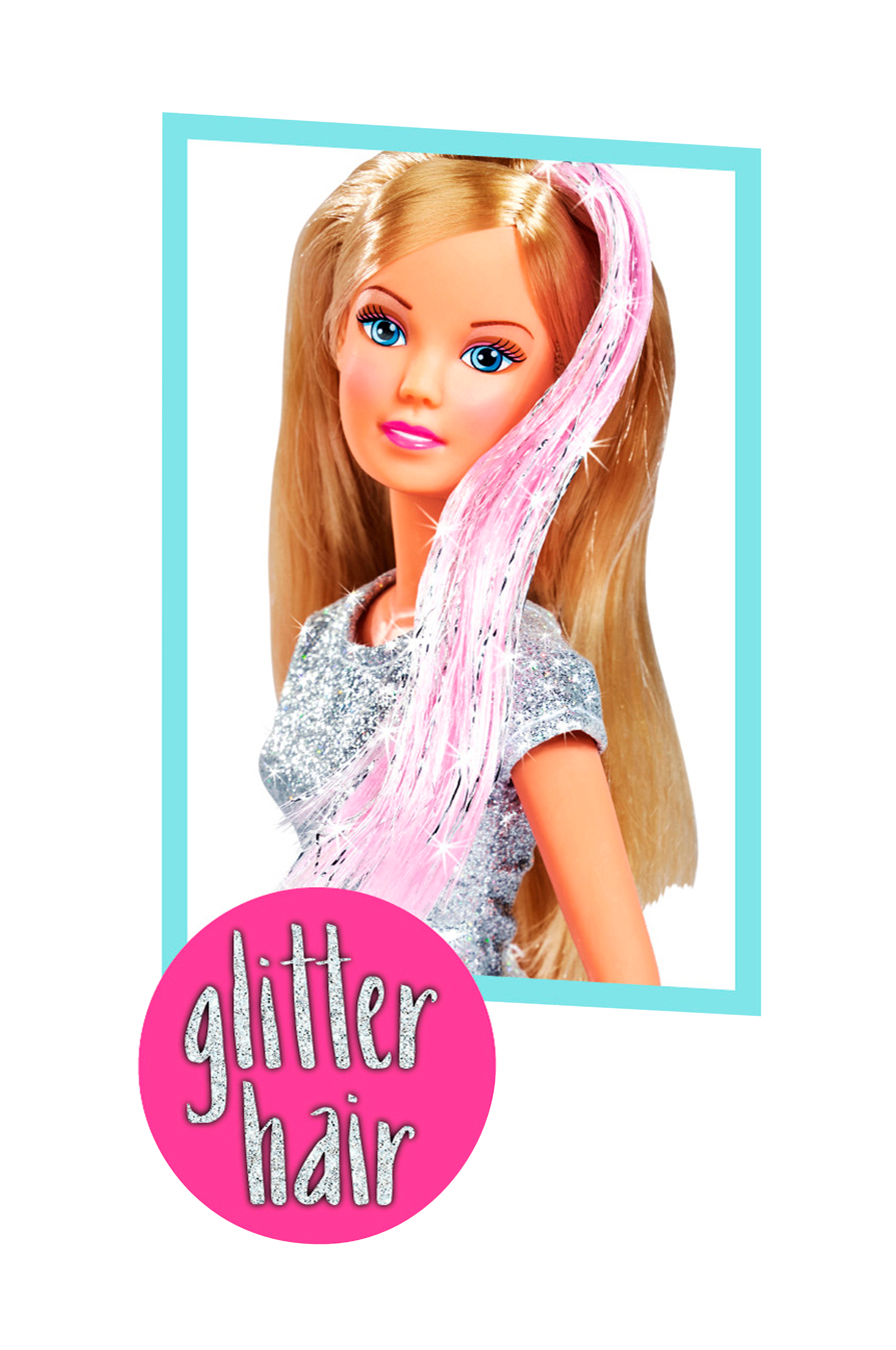 Steffi i moderigtigt tøj med mange detaljer, pelsjakke, glittertrøje og håndtaske.