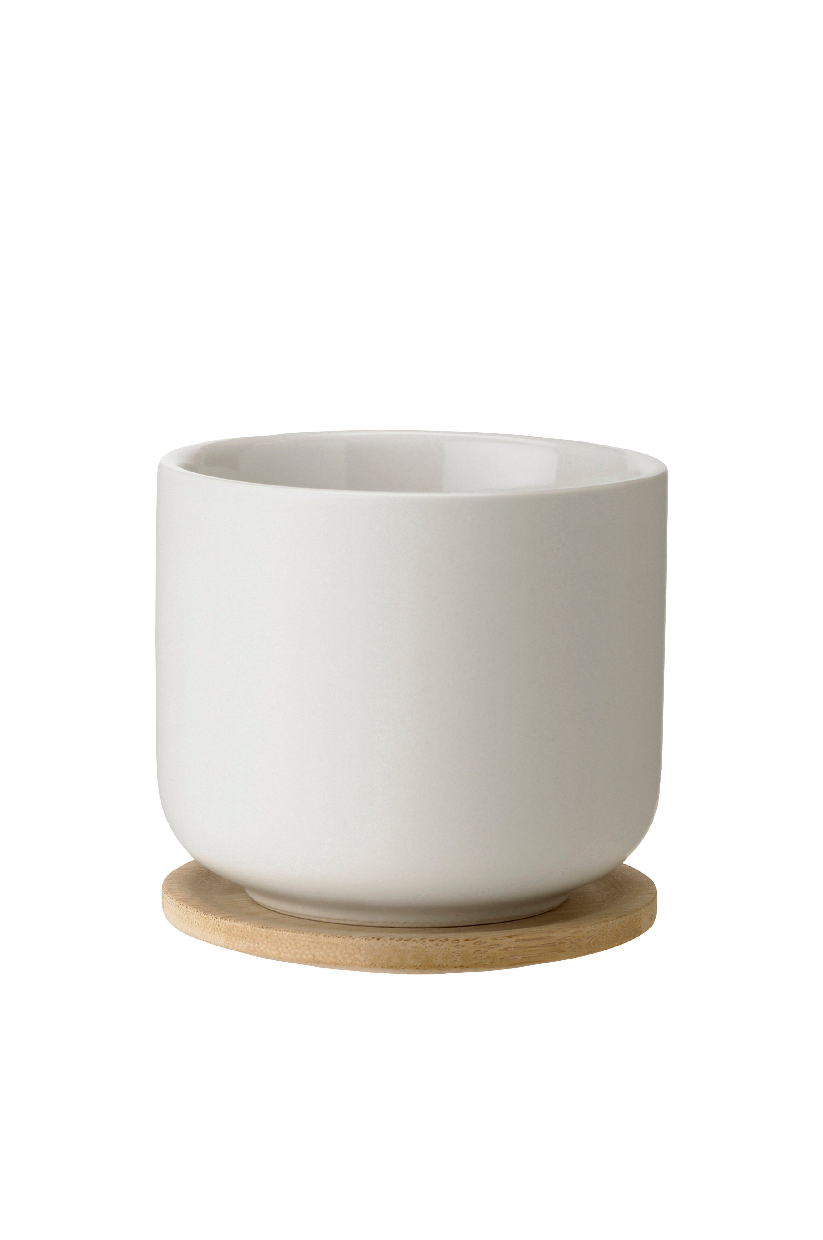Tekop i stentøj med enkle, skandinaviske linjer. Koppen har et underlag af bambus som giver et varmt og roligt præg.