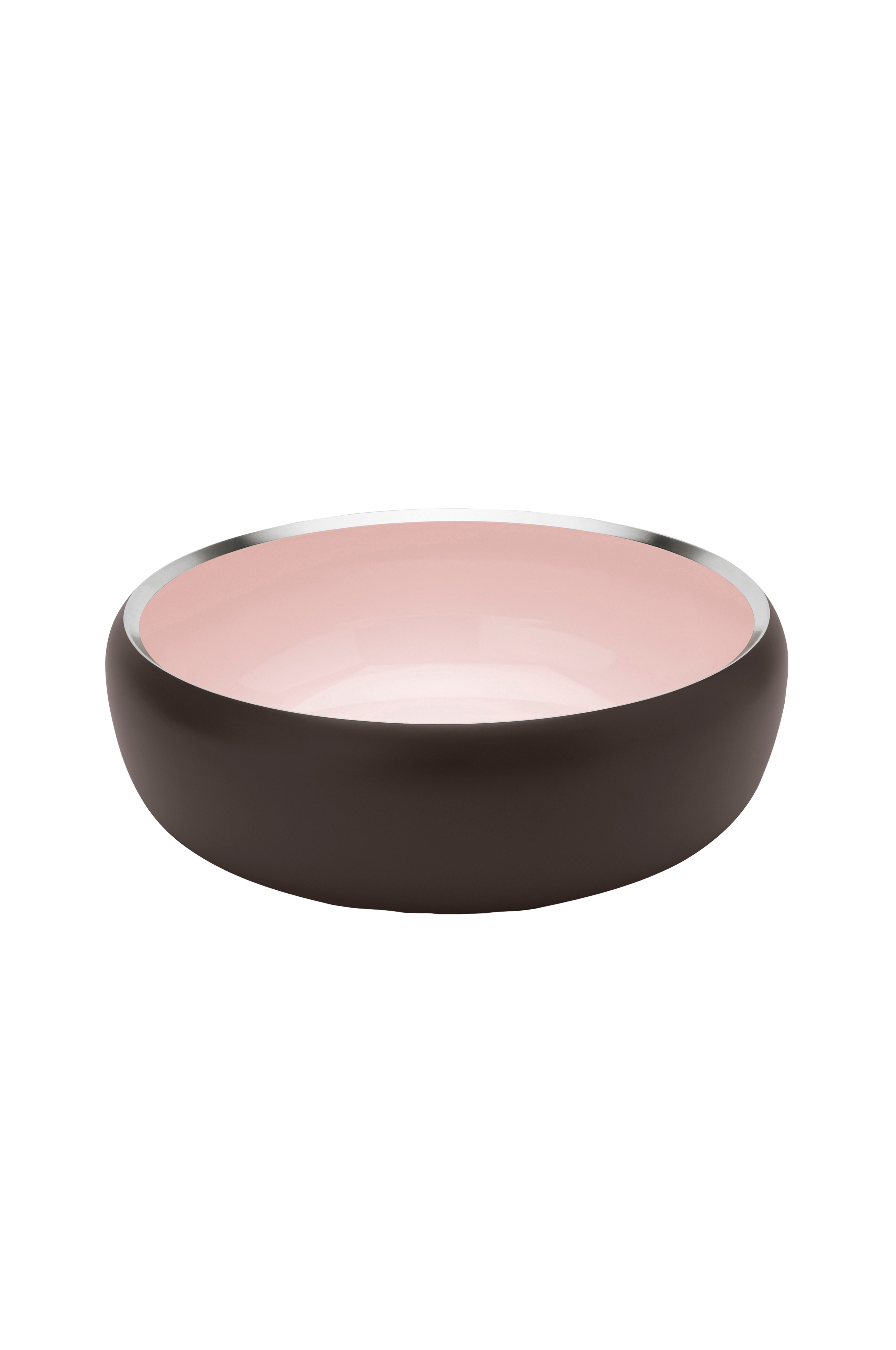 Skål med rund, organisk form med mat yderside og blank inderside som holdes sammen med en dekorativ stålkant foroven.