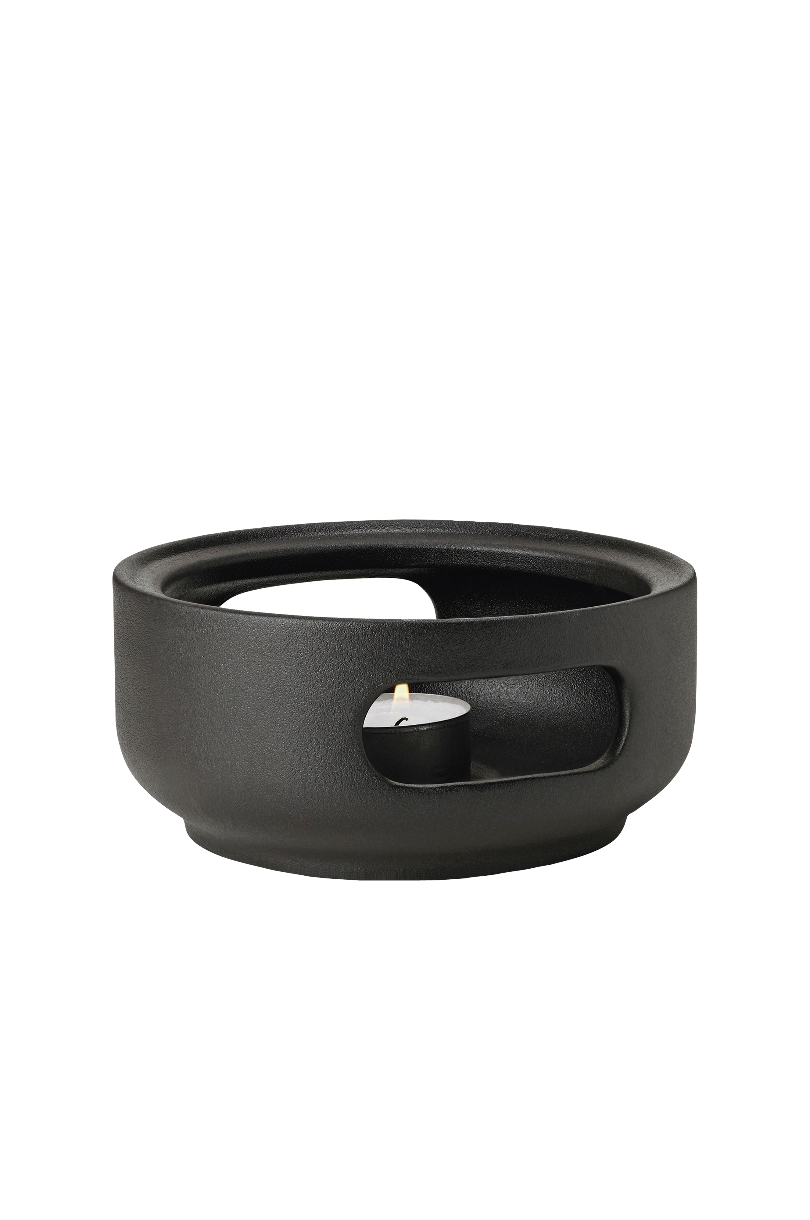Tekandevarmer lavet af sortbrunt, klassisk skandinavisk stentøj med støbejernsfinish. Tekandevarmeren holder tekanden varm med et fyrfadslys. Kan også bruges til at holde en sauce varm.