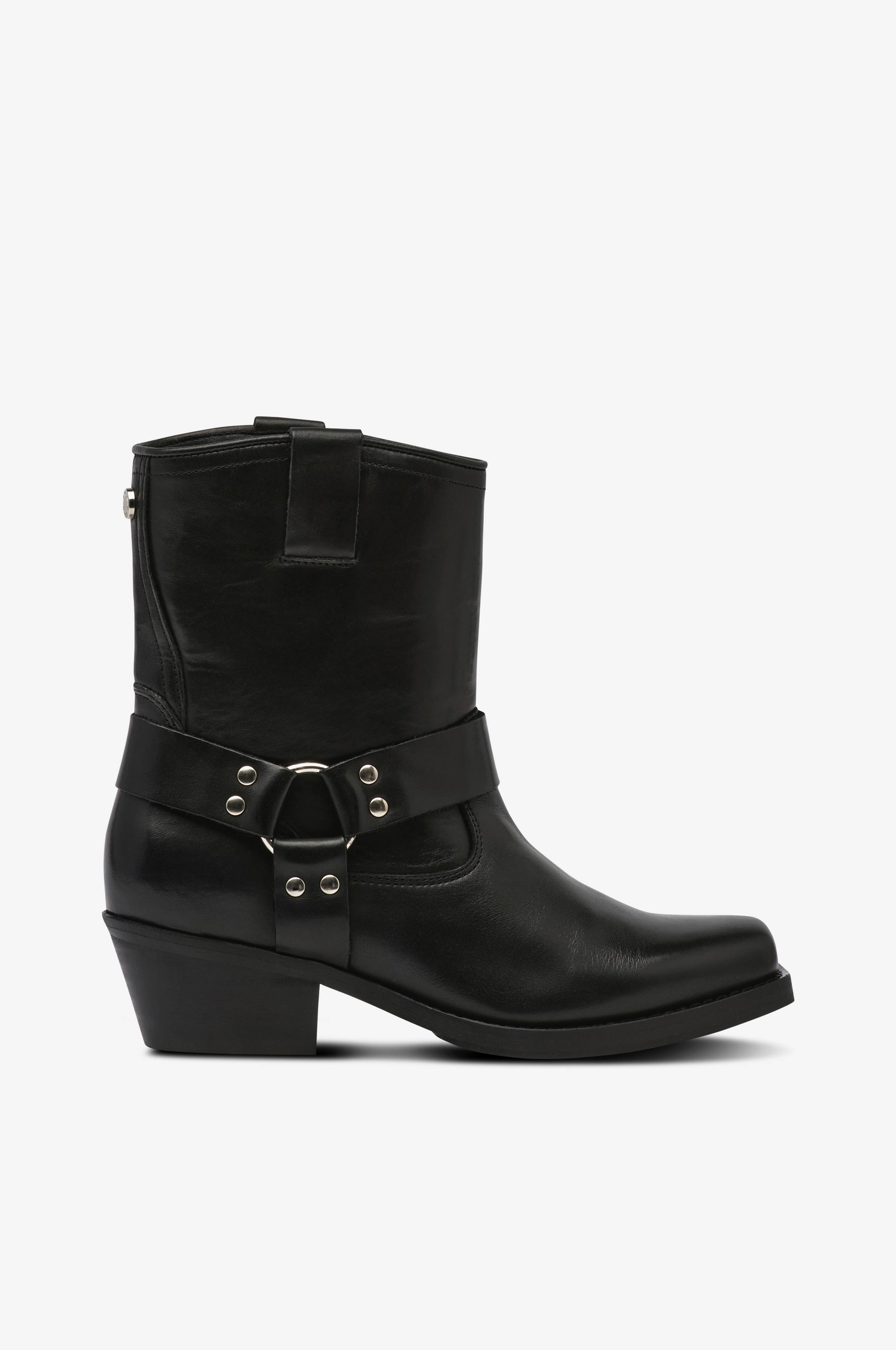 • Model i læder i cowboystil• Lige snude• Dekorativ strop med nitter omkring anklen• Trækstropper på toppen• Tekstilforing• Indersål i læder• Skafthøjde: 17 cm i str. 37• Hælhøjde: 5 cm