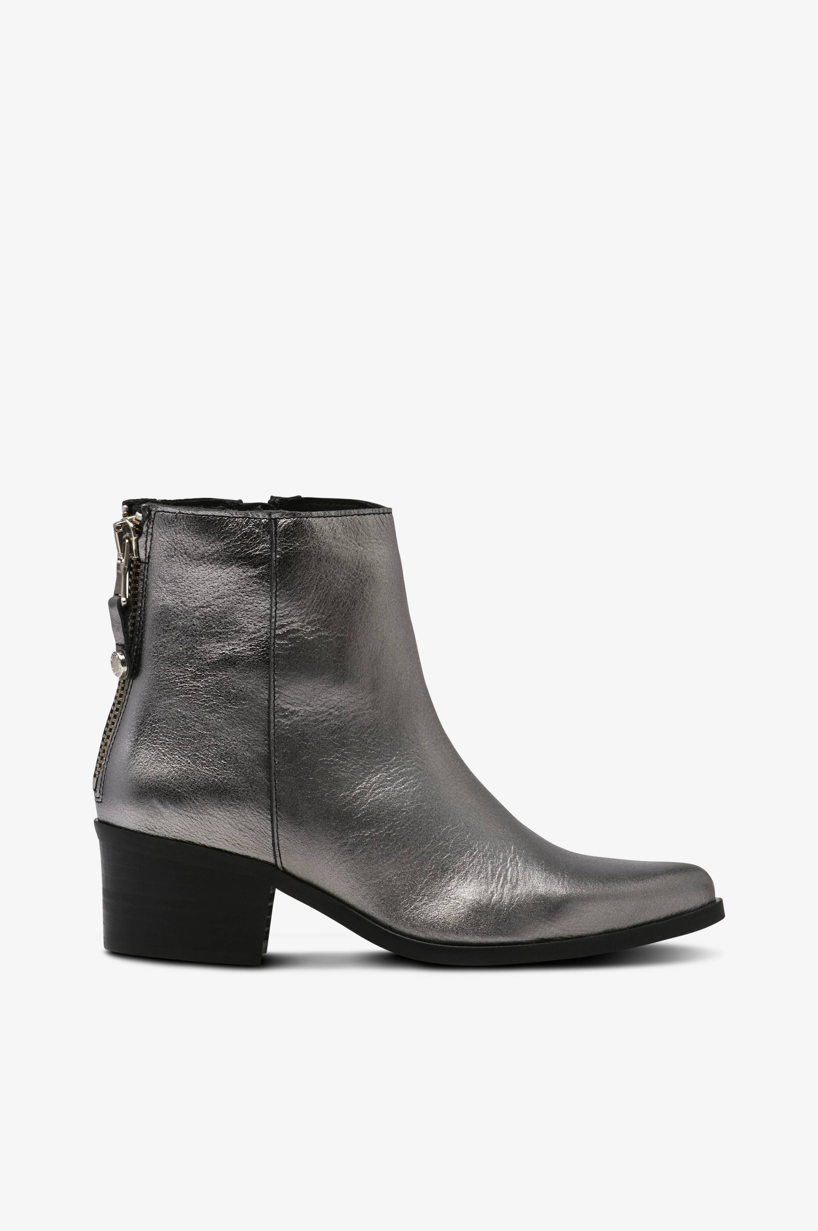 • Boots i læder• Spids snude• Lynlås på indersiden af skaftet• Dekorativ lynlås bagpå• Skafthøjde: 13 cm i str. 37• Hælhøjde: 5 cm