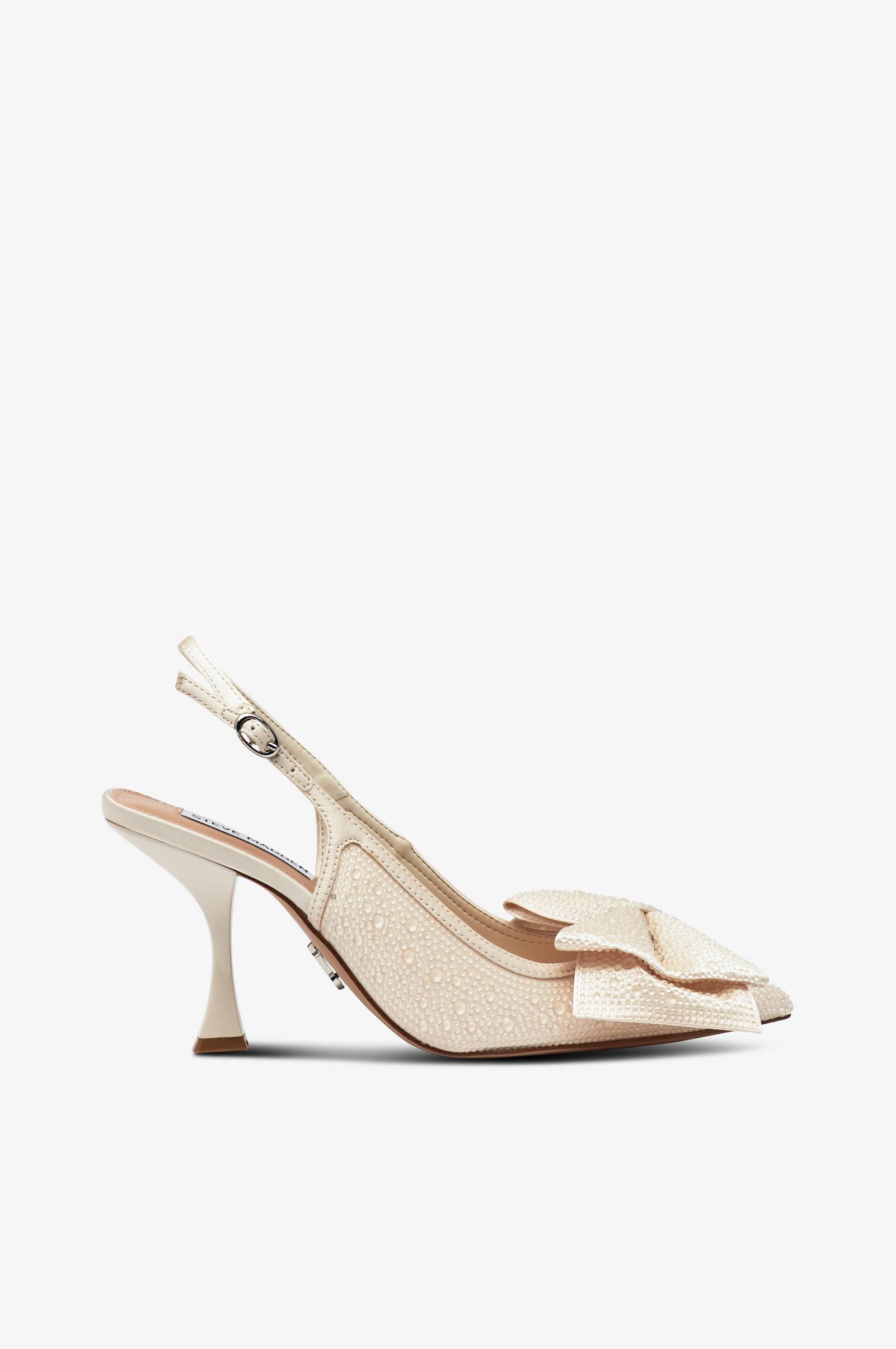• Slingback i satin med rhinstene hele vejen rundt• Stort, dekorativt bånd foran• Spids tåform• Justérbar hælrem med spænde og elastisk Vedhæftning• Blød polstret indersål• Hælhøjde: 8 cm