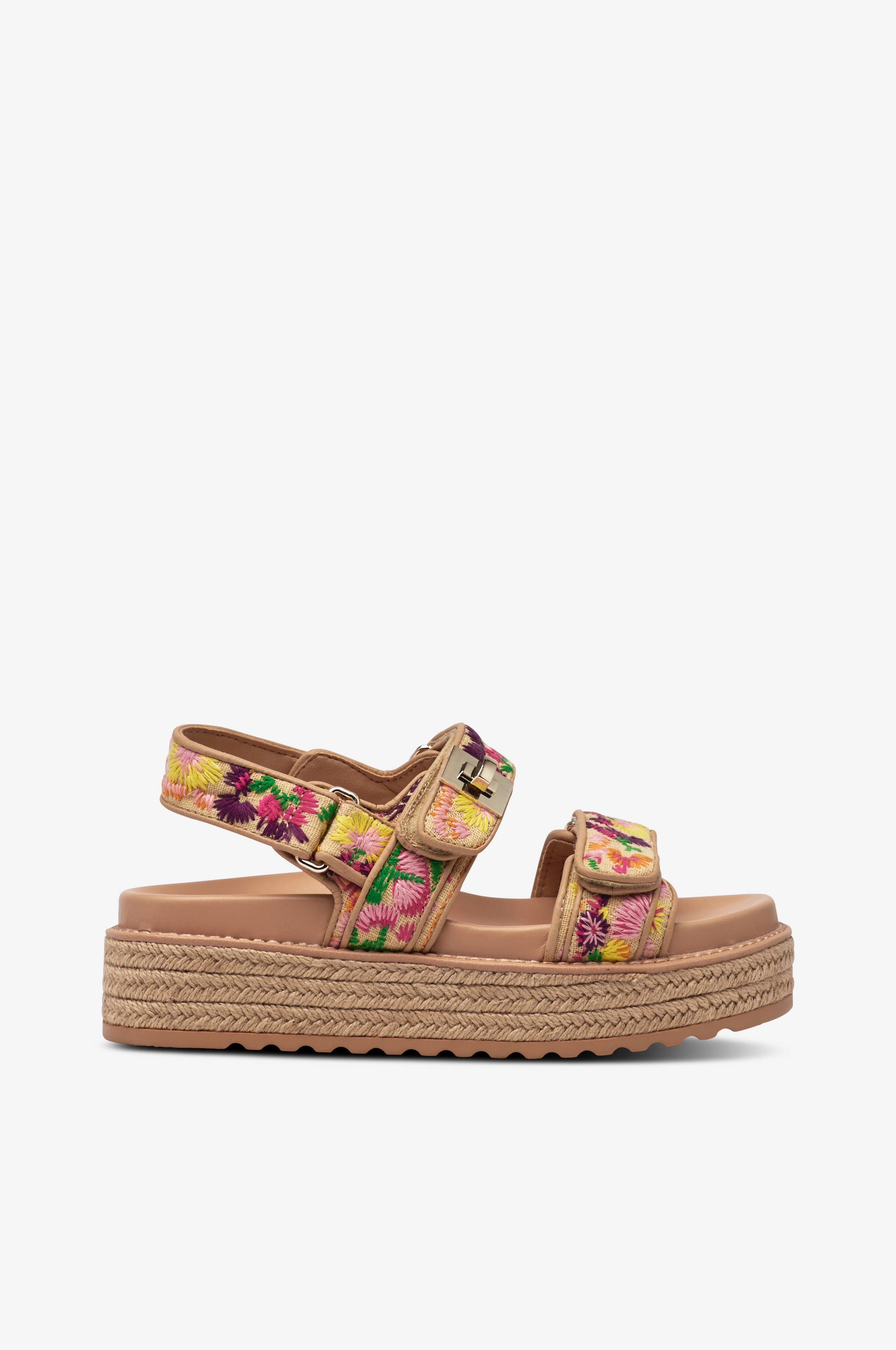 • Sandaler i tekstil med broderede blomster• Platformsål• To justérbare velcrobånd• Formet fodseng• Rebbeklædt midtersål• Dekorativt spænde i guldfarvet metal• Sålhøjde: 3,5 cm