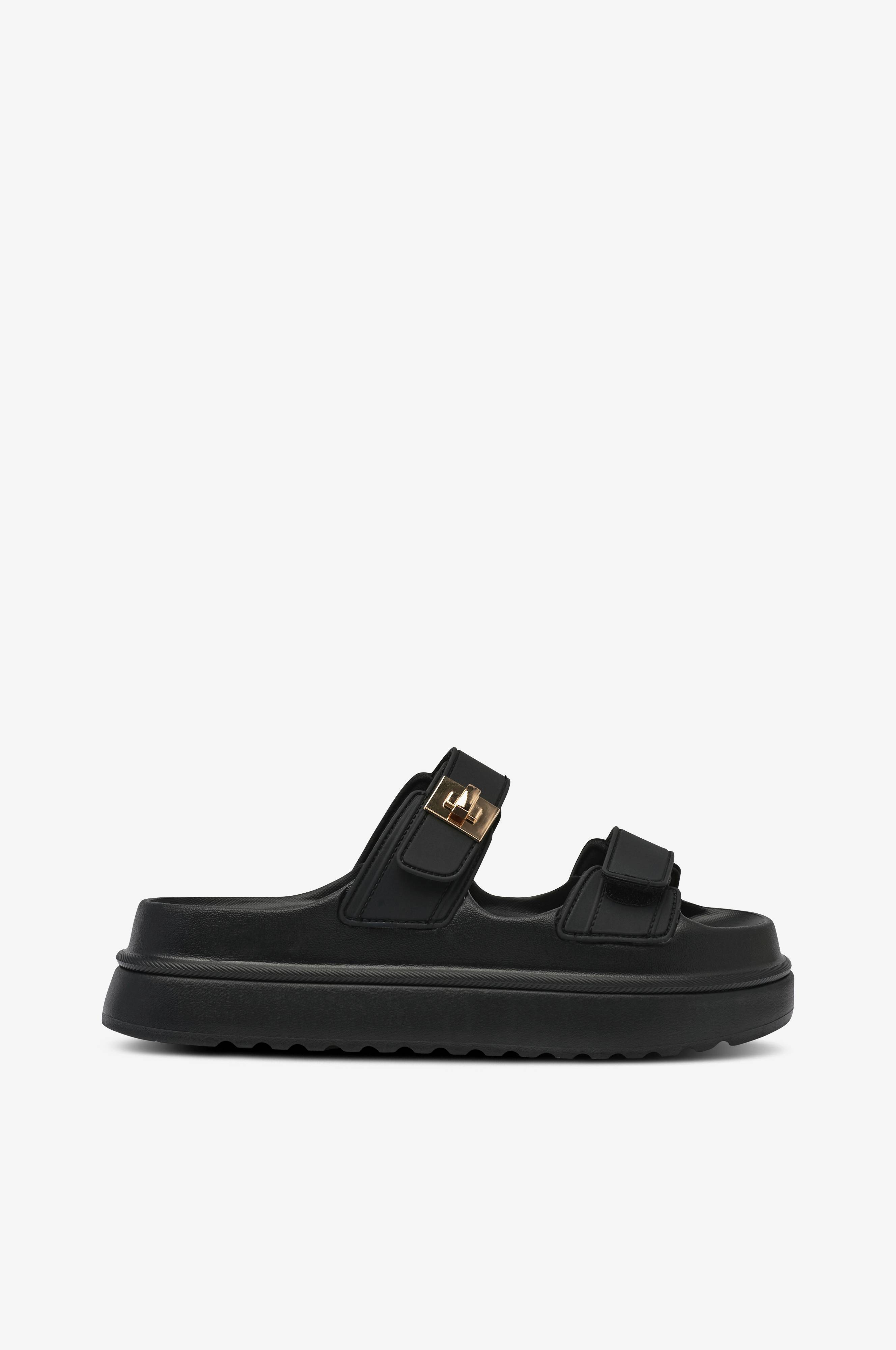 • Øvredel i kunststof• To justérbare velcrobånd• Dekorativ, guldfarvet detalje i metal på den ene rem• Tekstilforing• Ydersål i gummi• Sålhøjde: 5 cm