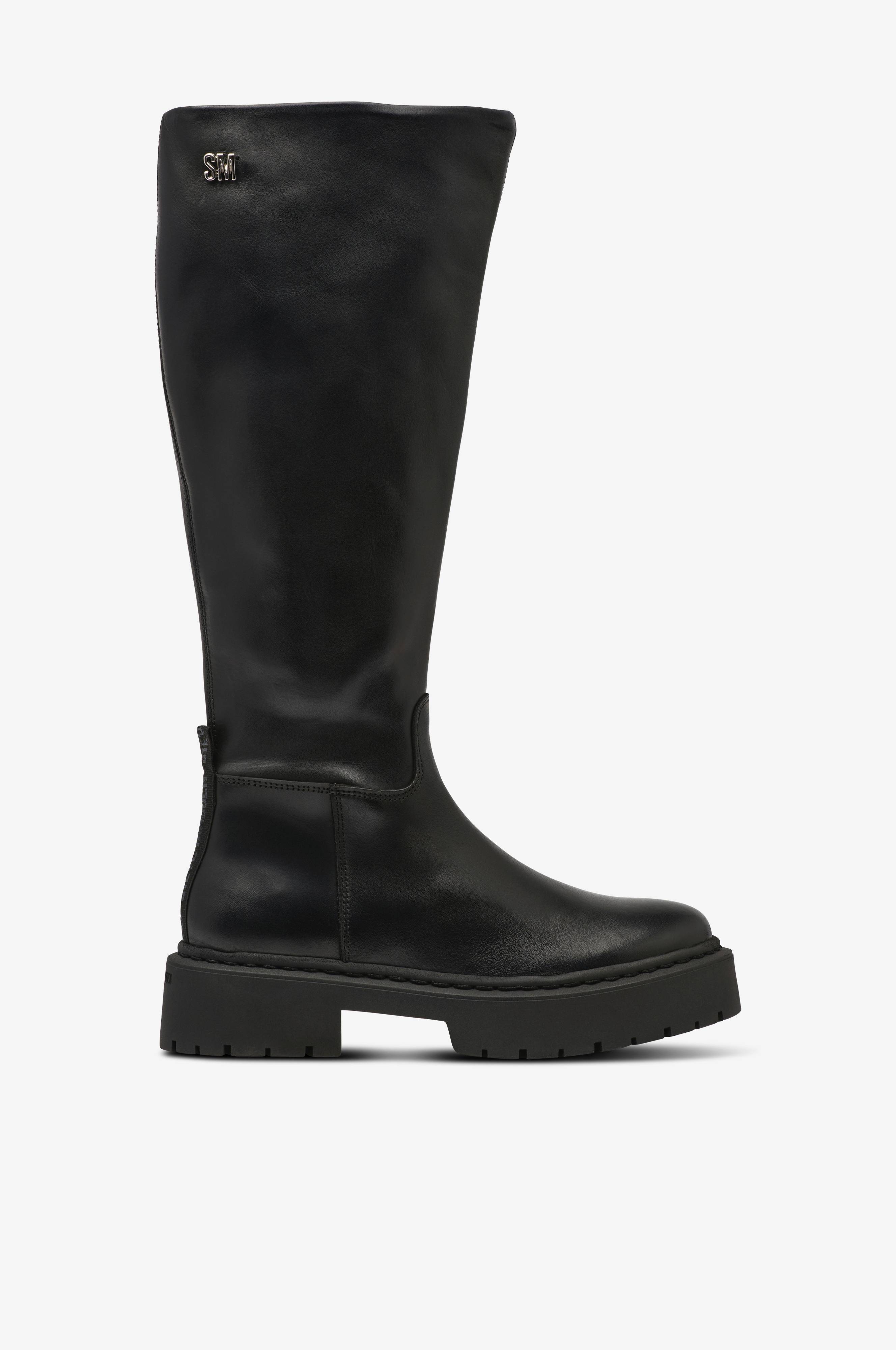 • Model i læder• Afrundet snude• Lynlås på indersiden af skaftet med lille elastisk panel øverst• Logobånd med trækstrop på hælen• Tekstilforing• Høj, grovmønstret sål• Skafthøjde: 38 cm i str. 37• Hælhøjde: 4,5 cm• Sålhøjde: 3 cm