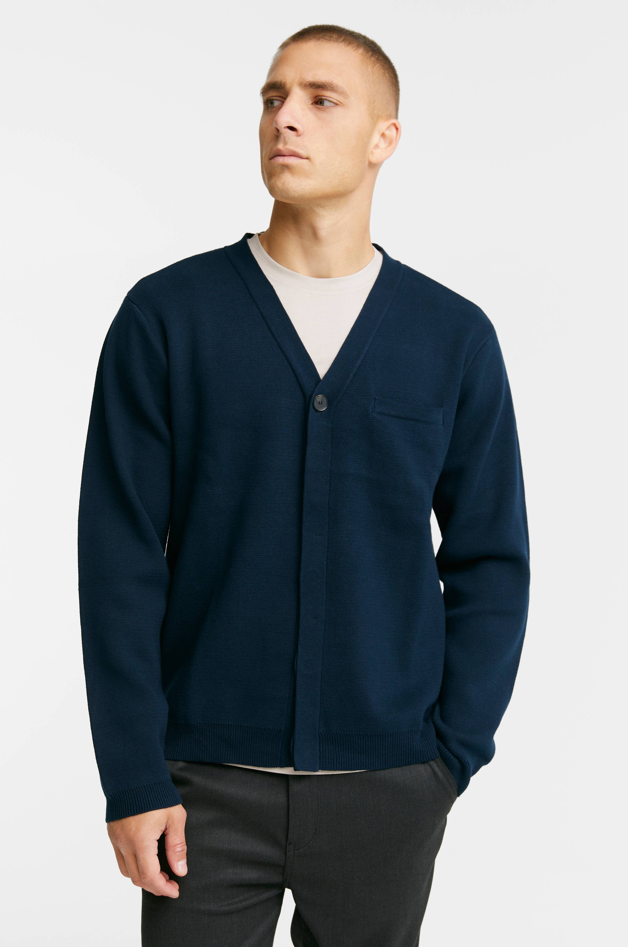 Strikket cardigan med v-udskæring og knapper.