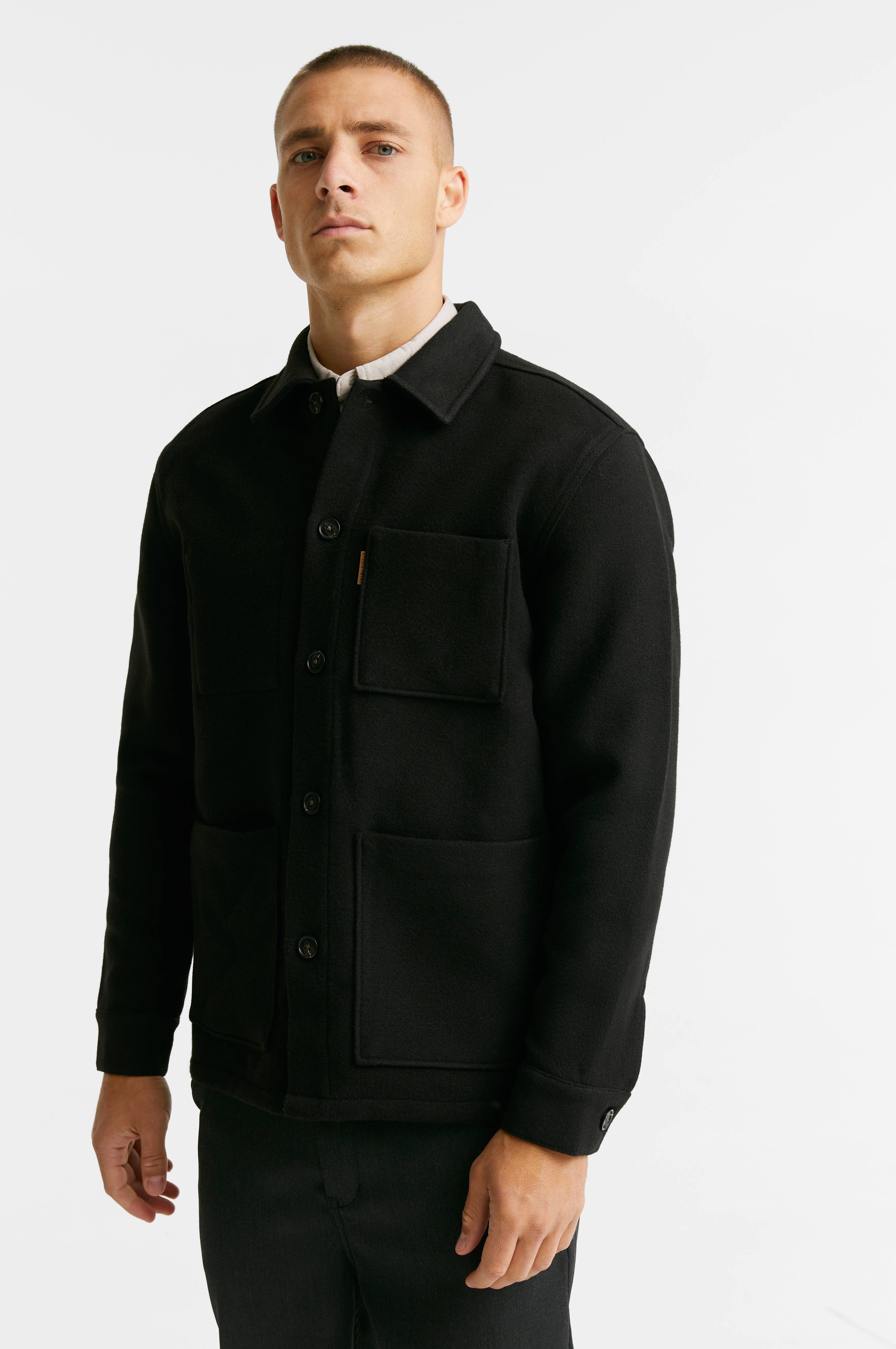 Overshirt i filtet, kraftig kvalitet. Lukning med knapper. To lommer forneden og en brystlomme. Knap i ærmekant. Slids forneden bagpå. Længde ca. 74 cm i str. M.