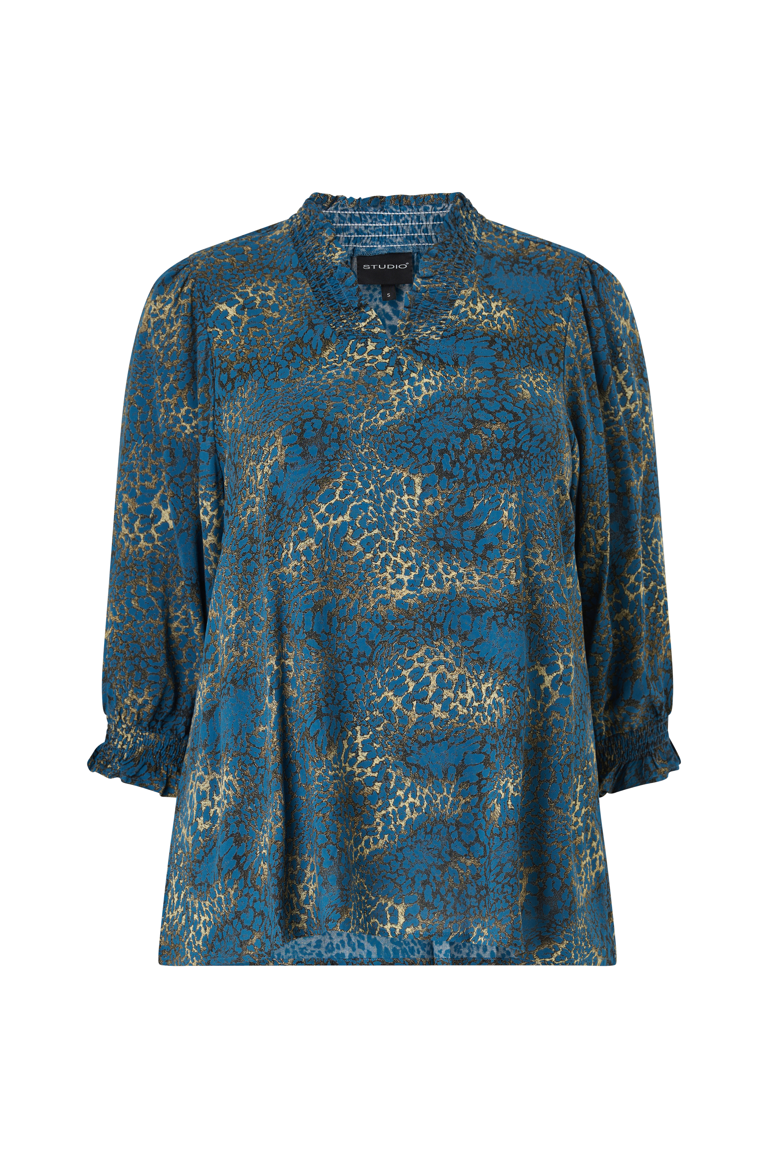 • Bluse i viskose med printet mønster• V-formet halsudskæring med smock hele vejen rundt• 3/4 lange ærmer med smock og volant ved manchetterne• Store størrelser