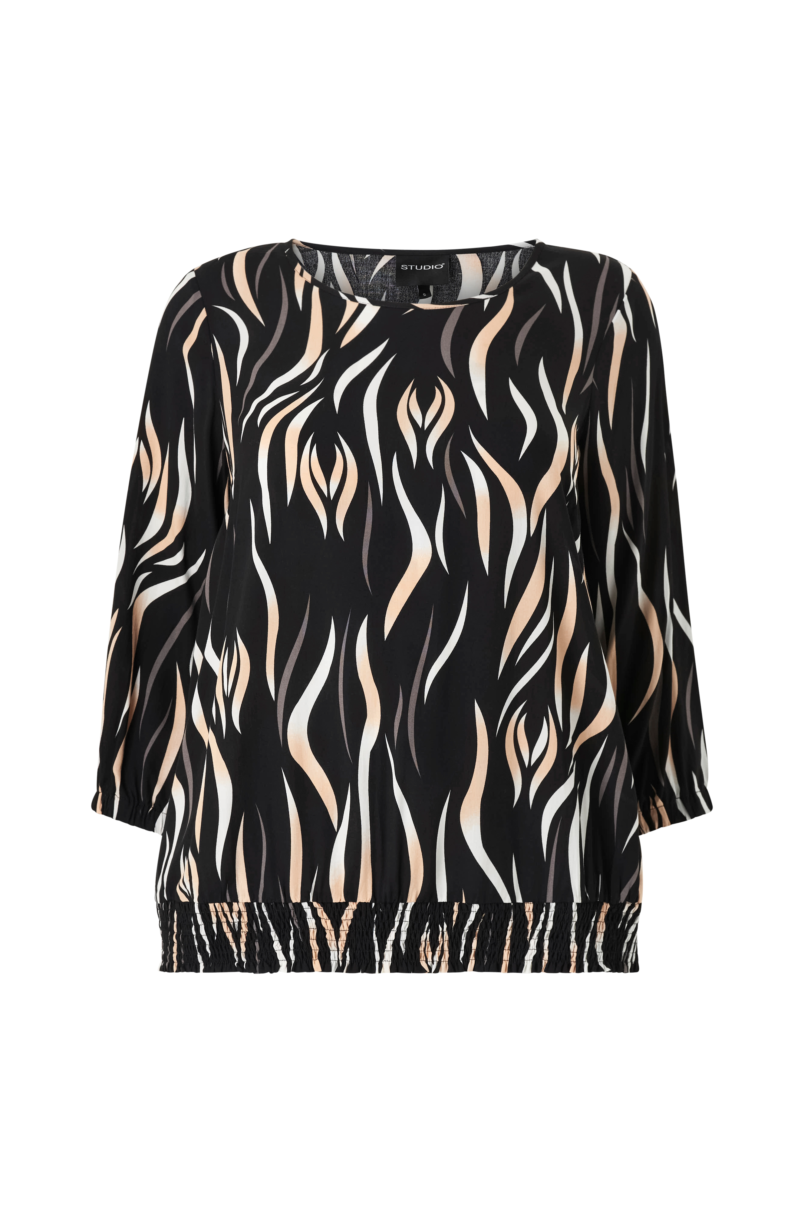 • Bluse i viskose med printet mønster• Rund halsudskæring• Lange ærmer med elastik ved manchetterne• Smock ved nederste kant• Store størrelser