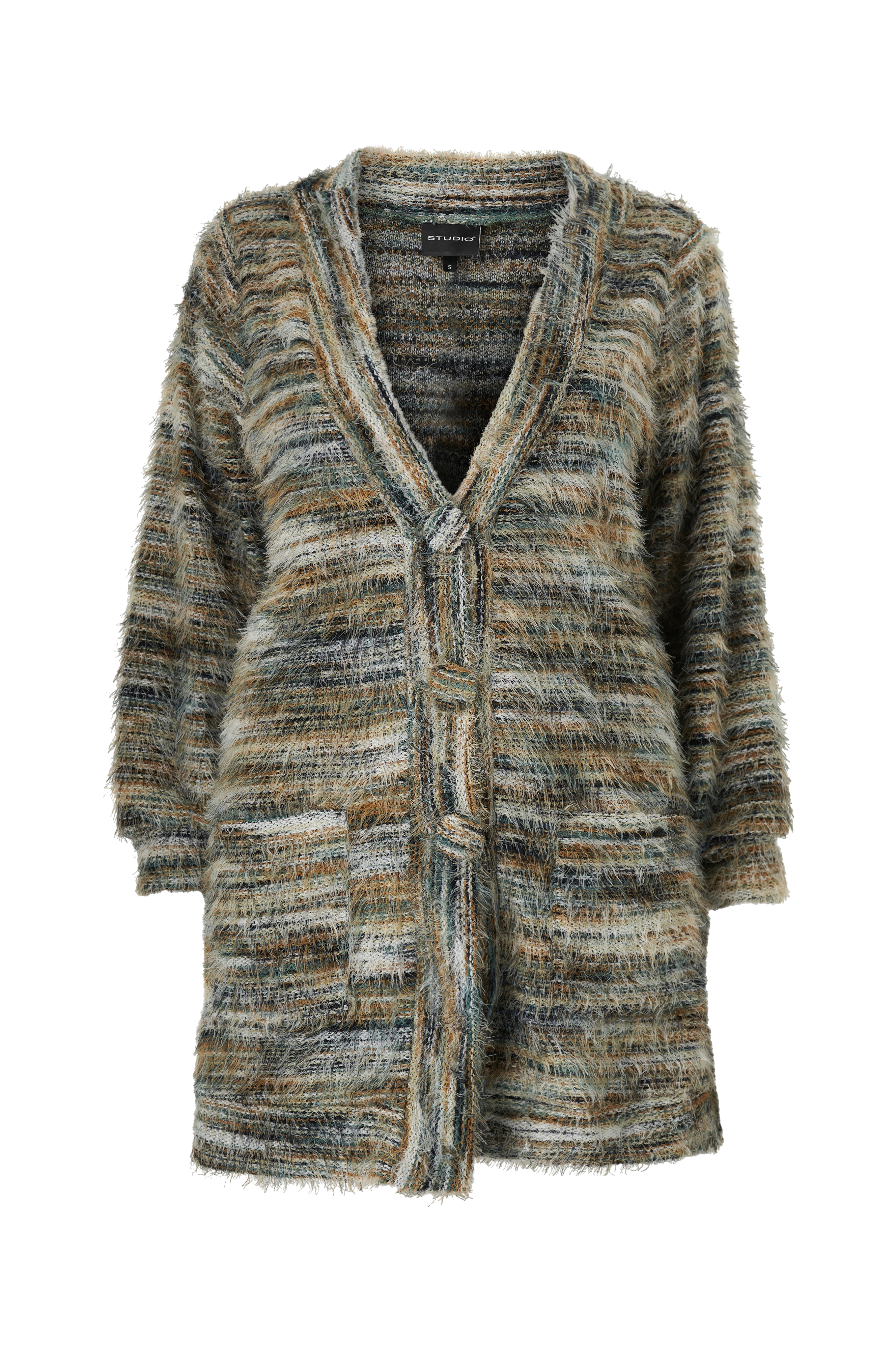 • Lang, bred model• Dyb v-udskæring• Store, beklædte knapper foran• Langt ærme• Lommer