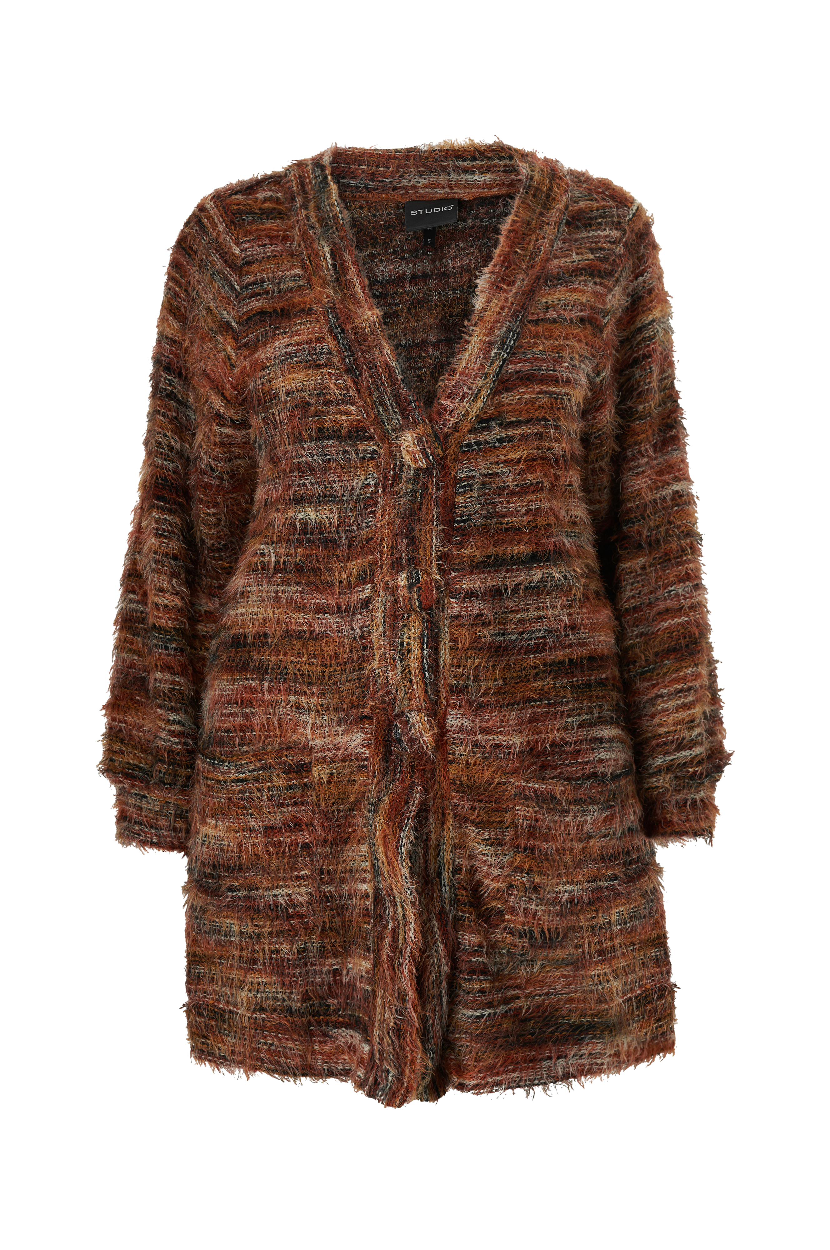 • Lang, bred model• Dyb v-udskæring• Store, beklædte knapper foran• Langt ærme• Lommer