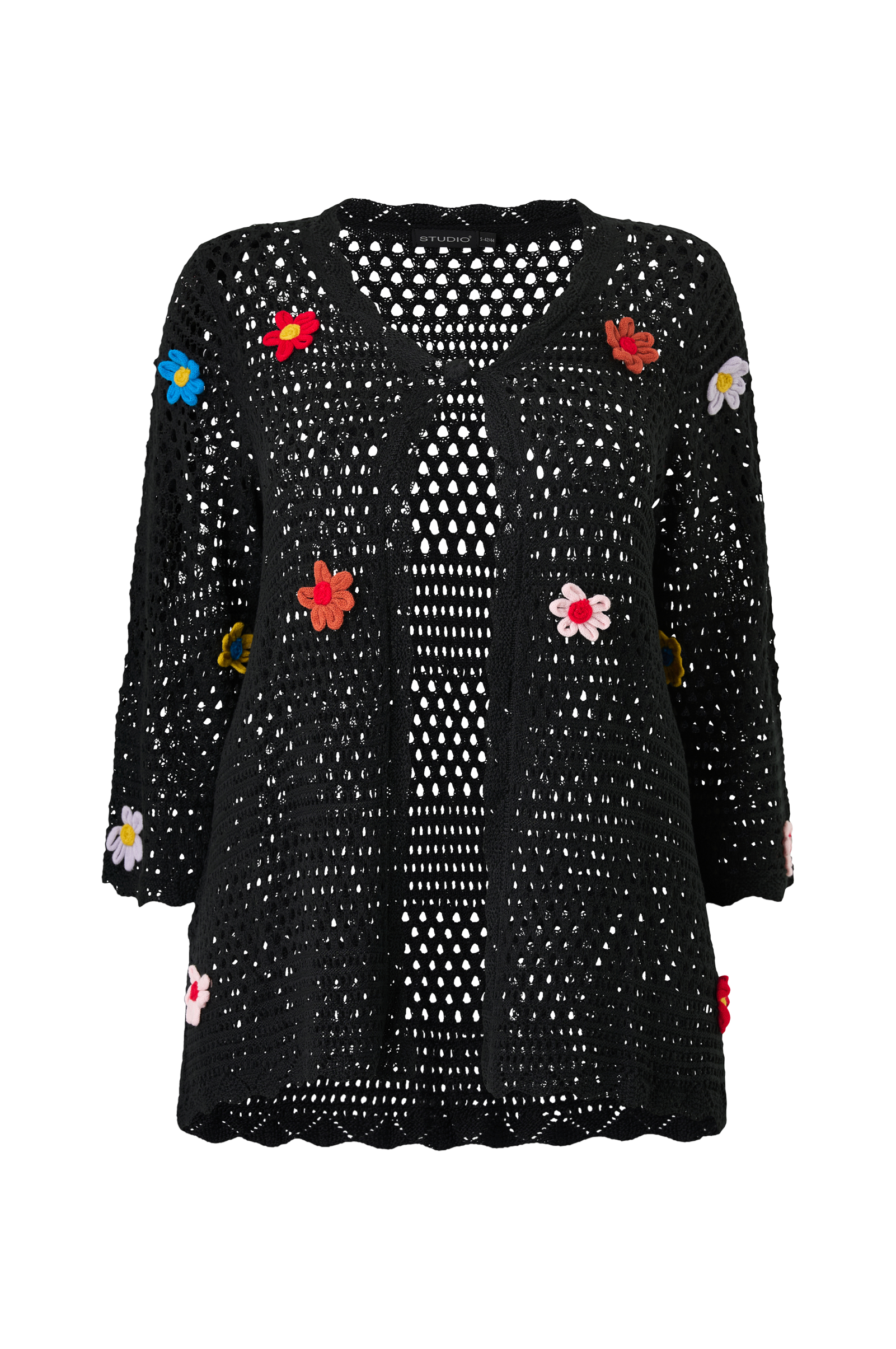 • Løststrikket cardigan med blomsterapplikationer foran• Rund halsudskæring med beklædt knap• Lange ærmer• Slidser nede i siderne• Plusstørrelser