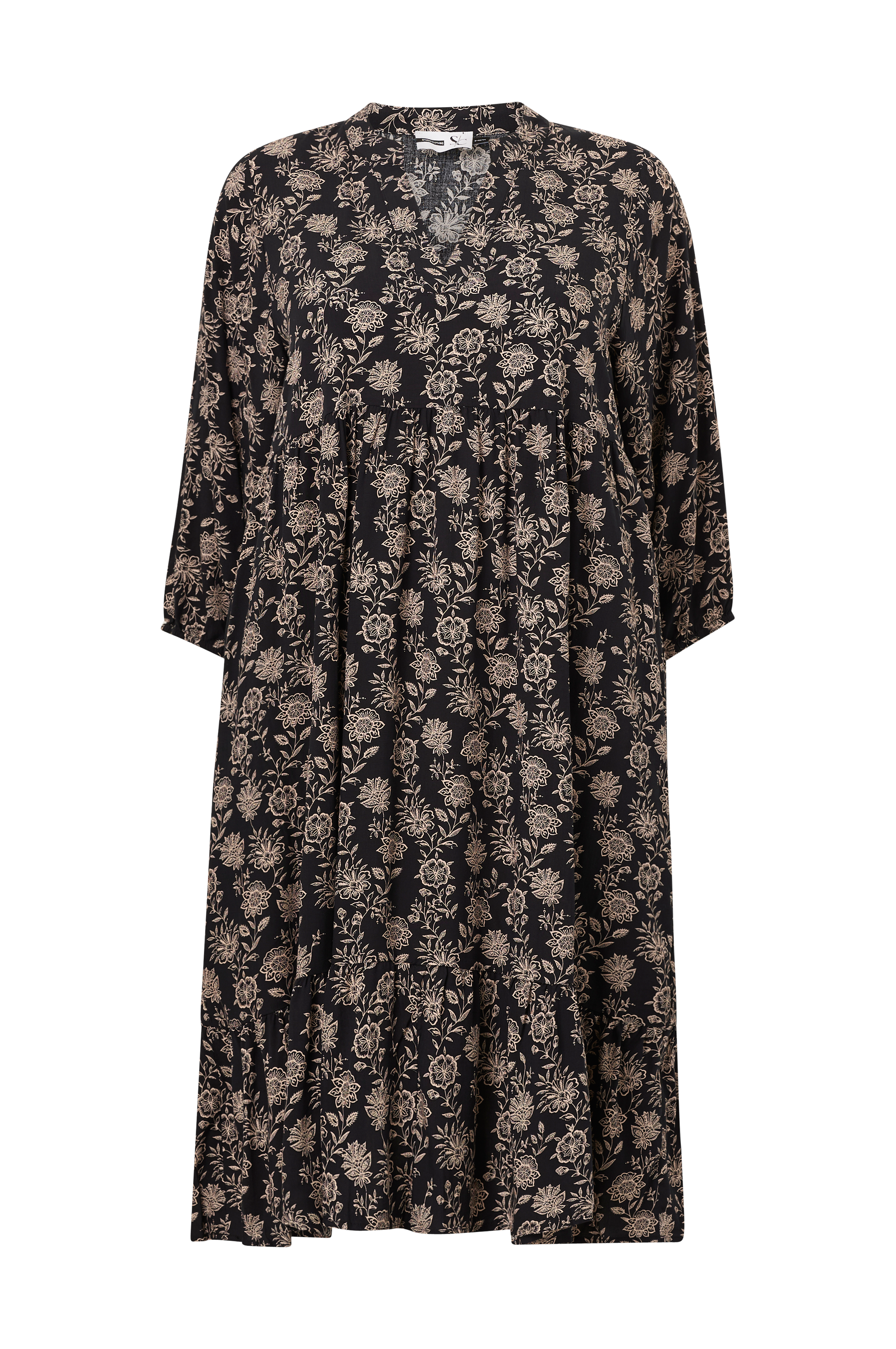 • Store størrelser• Model med svaj• Defineret, rynket talje• V-udskæring foran• Bredt, 3/4 langt ærme med elastisk bånd ved manchetterne• Indlagte sidelommer• Længde: 112 cm i størrelse S
