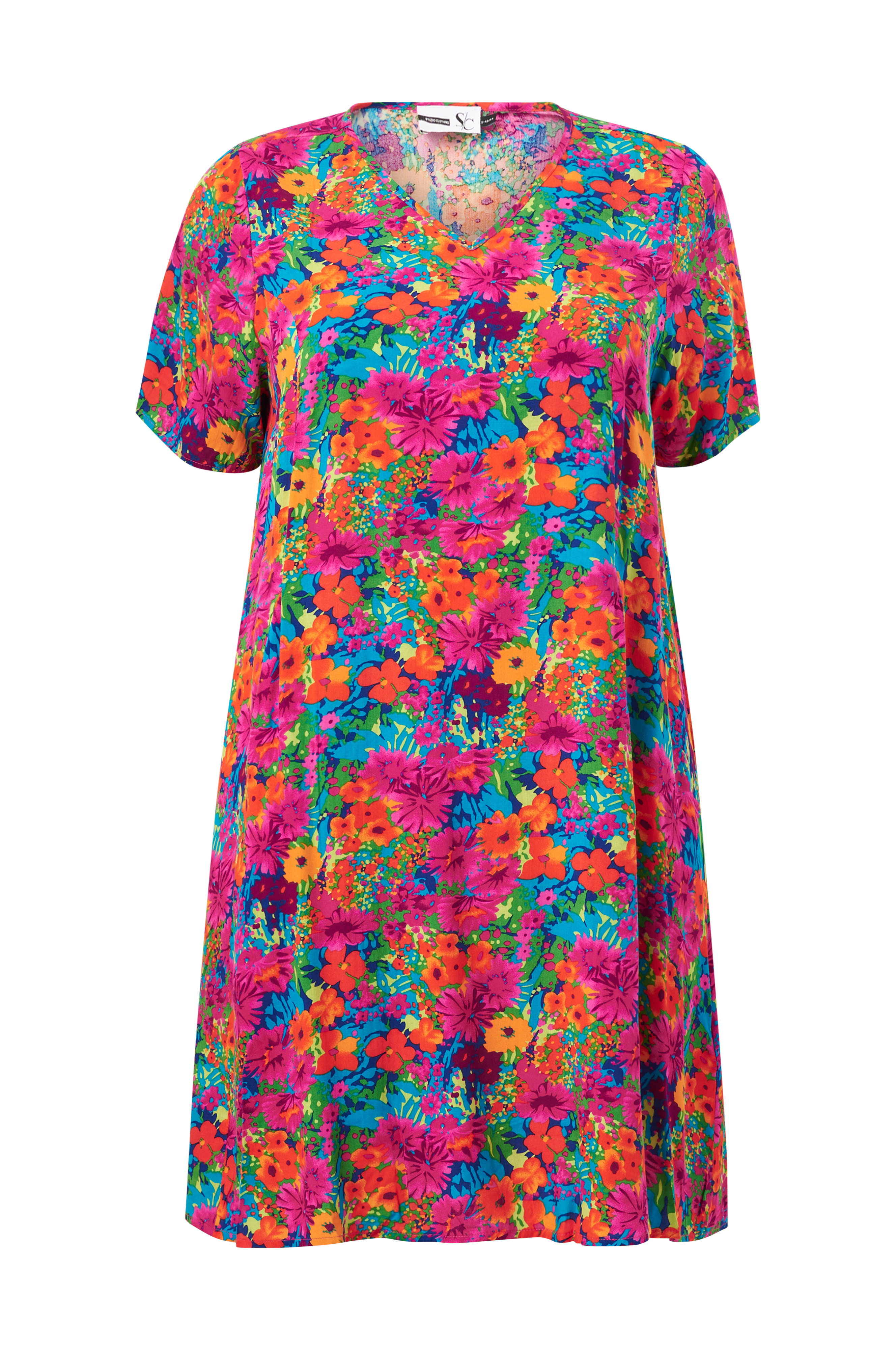 • Mønstret kjole i viskose• V-udskæring• Korte ærmer• Lommer foran• Store størrelser• Længde: 100 cm i størrelse S