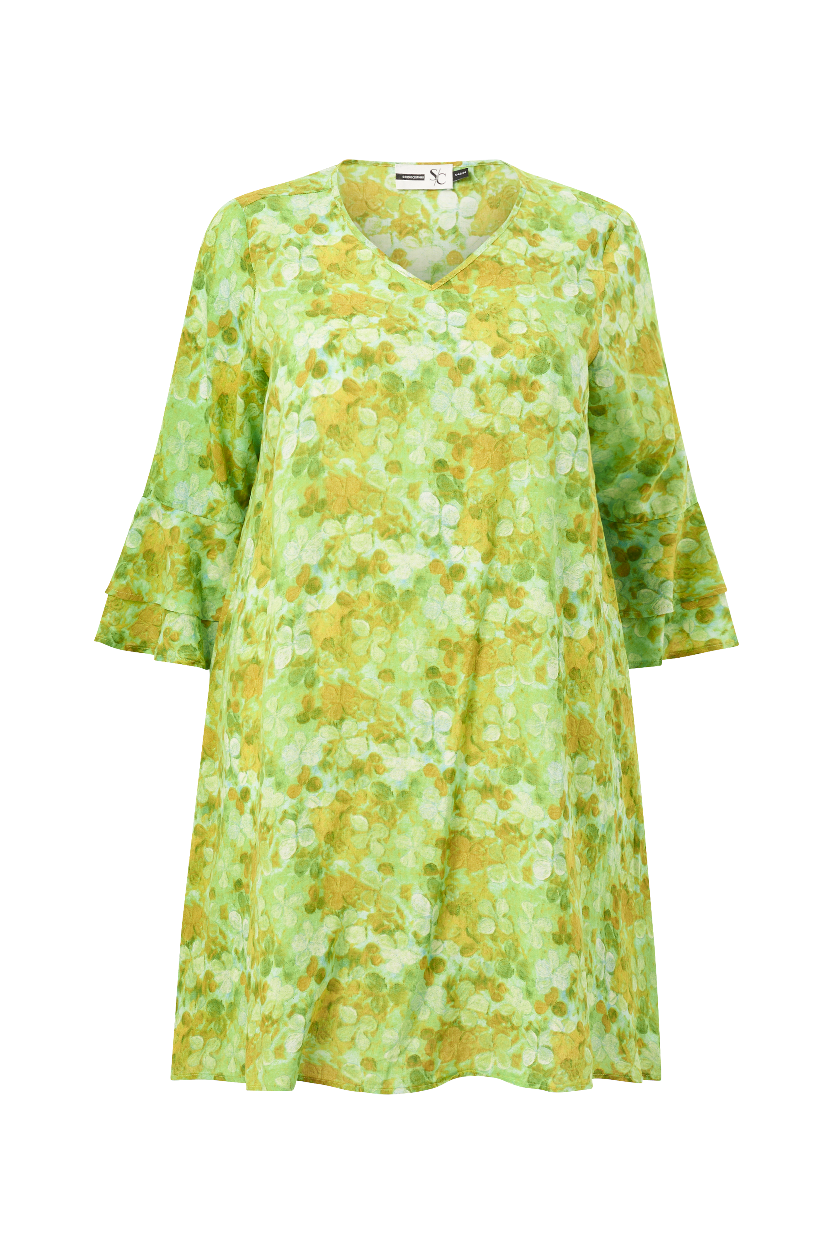 A-formet kjole i viskose med v-udskæring og 3/4-lange trompetærmer med dobbelte flæser i ærmekanterne. Længde ca. 97 cm i str. S.
