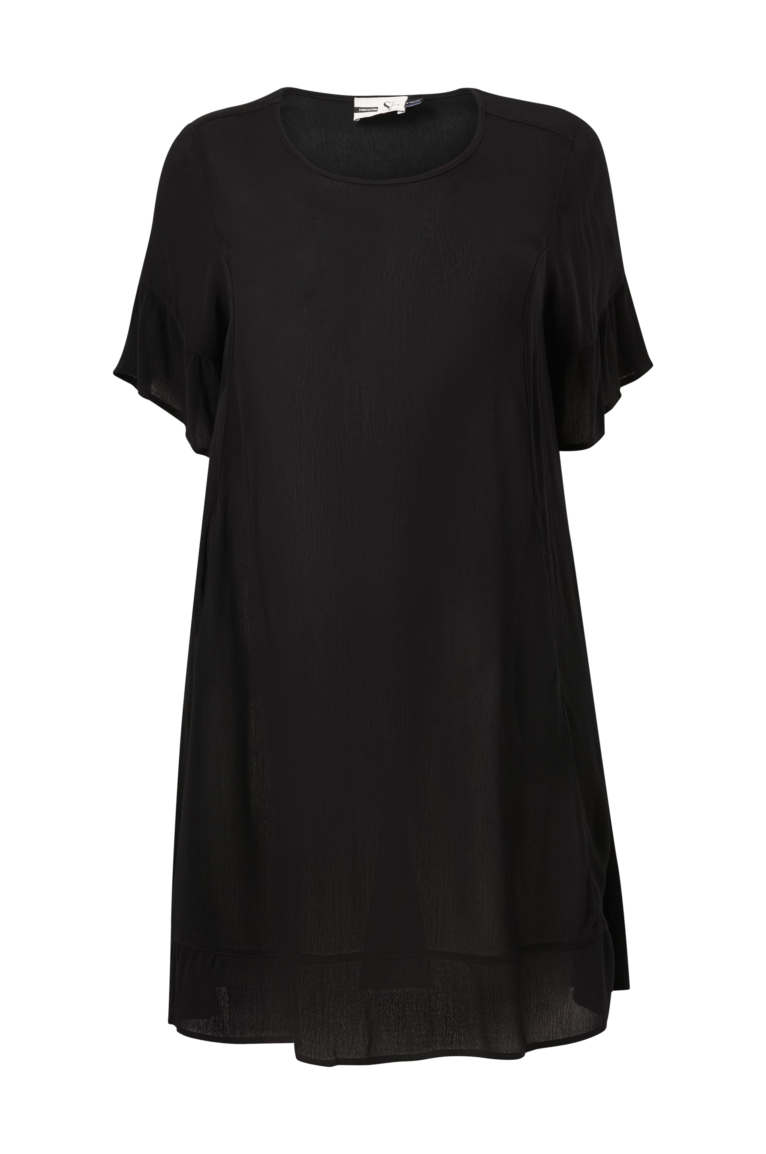 • Korte ærmer med volant• Lommer foran• Tynd, rynket kvalitet• Store størrelser• Længde: 100 cm i størrelse S