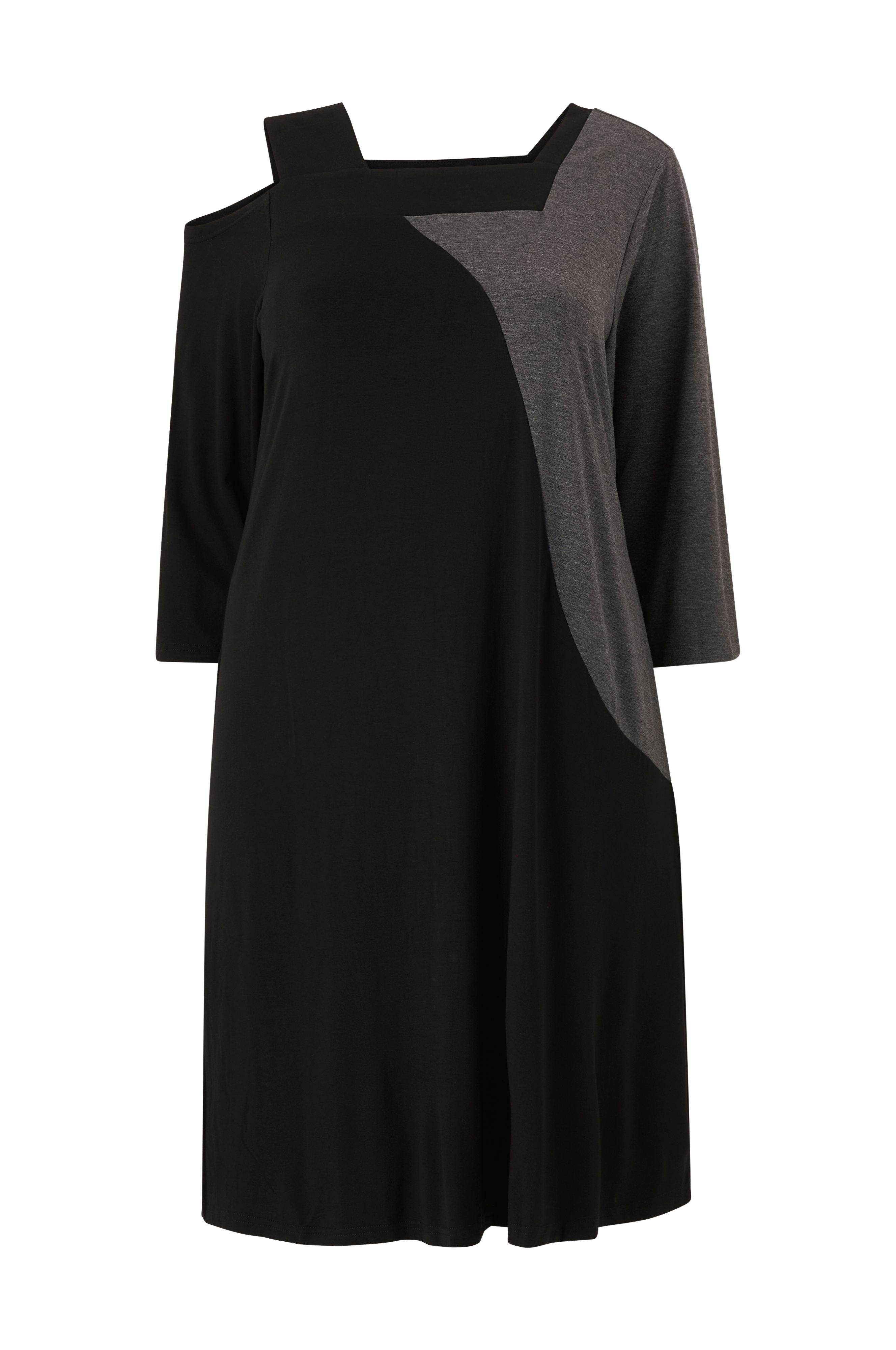 • Enskuldret, tofarvet design• 3/4 lange ærmer• Firkantet halsudskæring• Store størrelser• Længde: 105 cm i størrelse S