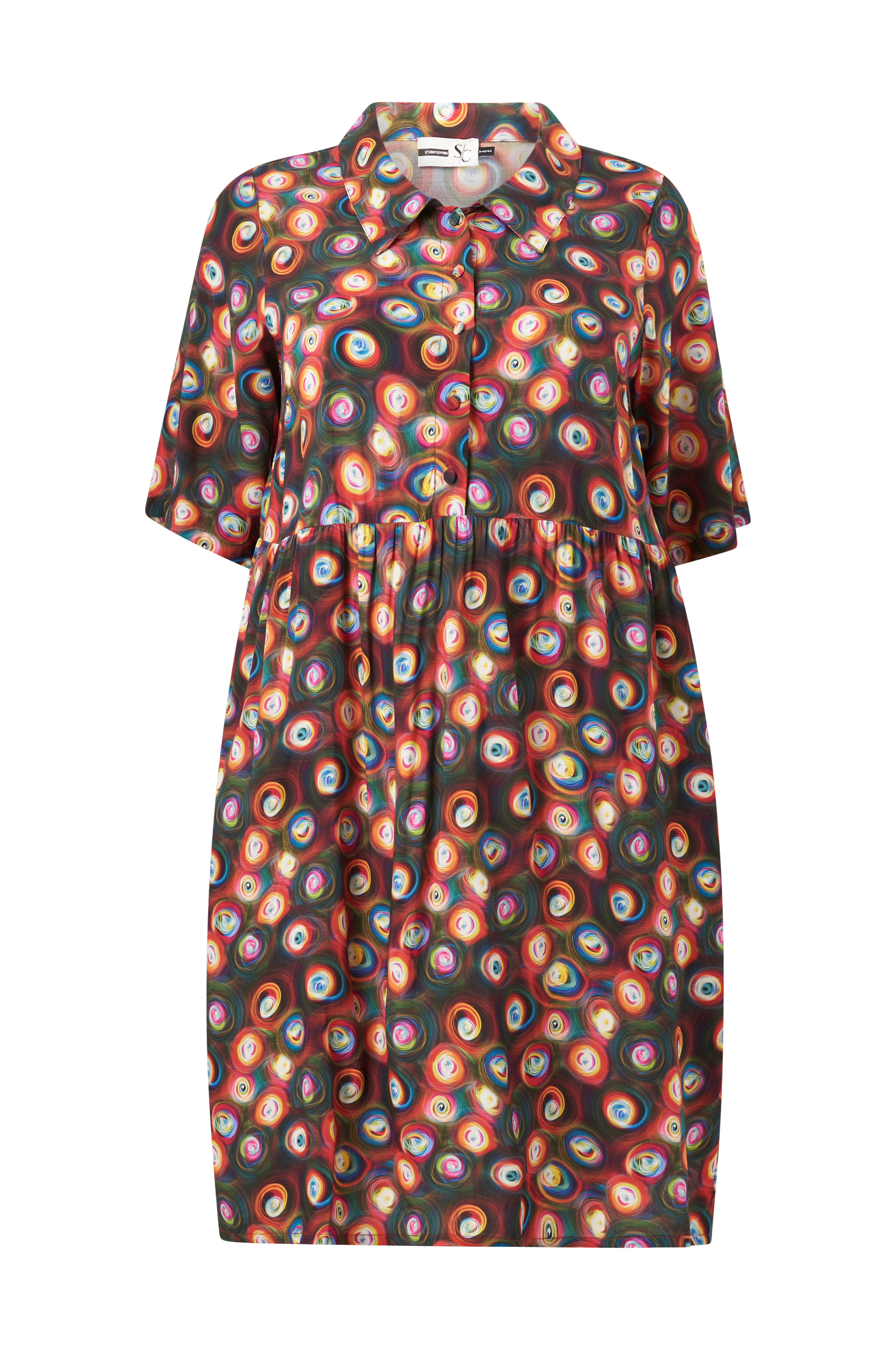 • Knapper oppe foran• Halvlange ærmer• Rynket talje• Lommer i siderne• Store størrelser• Længde: 107 cm i størrelse S