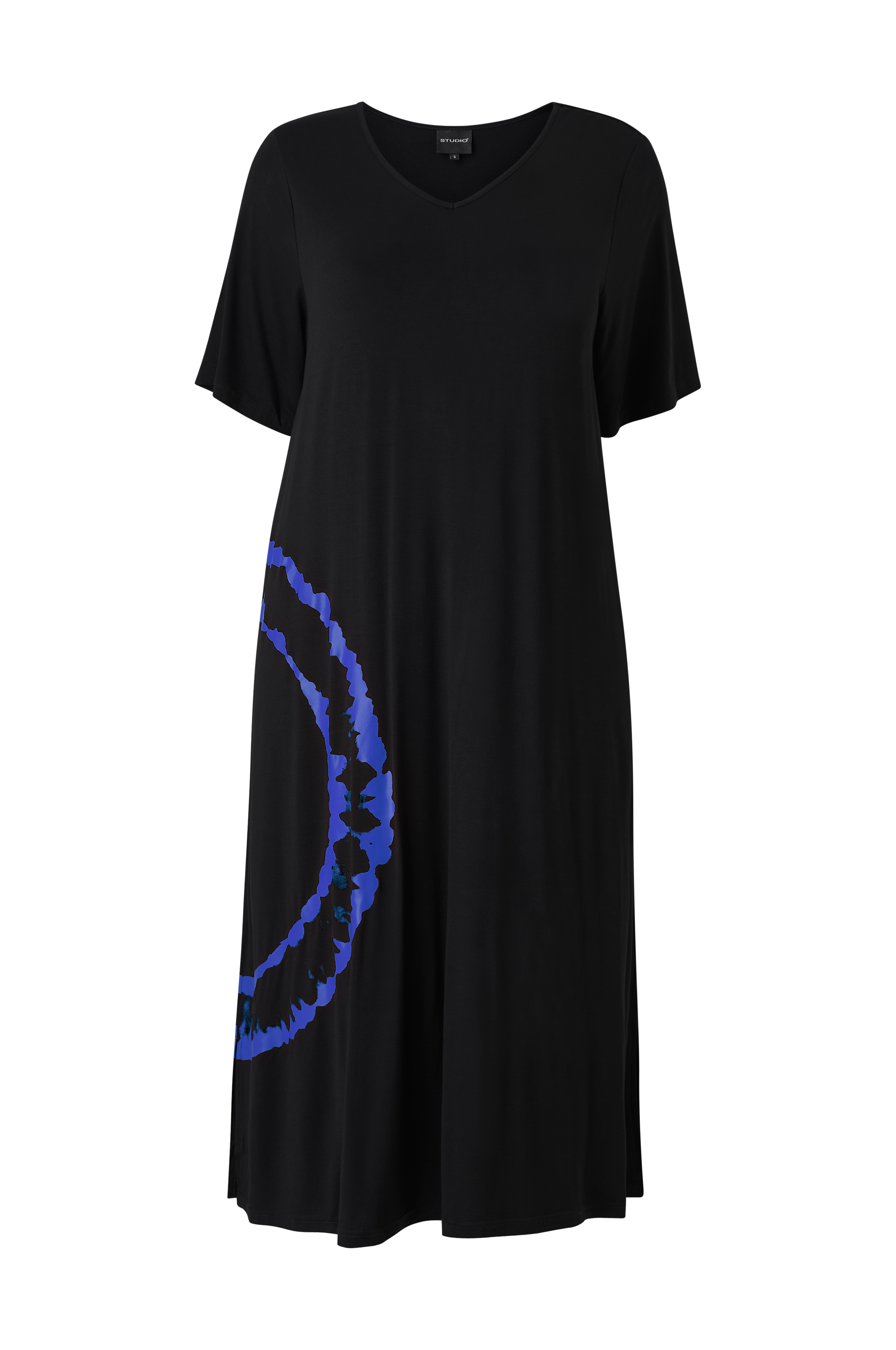• Kjole i blød, elastisk viskosejersey• V-formet halsudskæring• Kort ærme• Tryk på den ene side• Slidser i siderne• Store størrelser• Længde: 130 cm i størrelse S