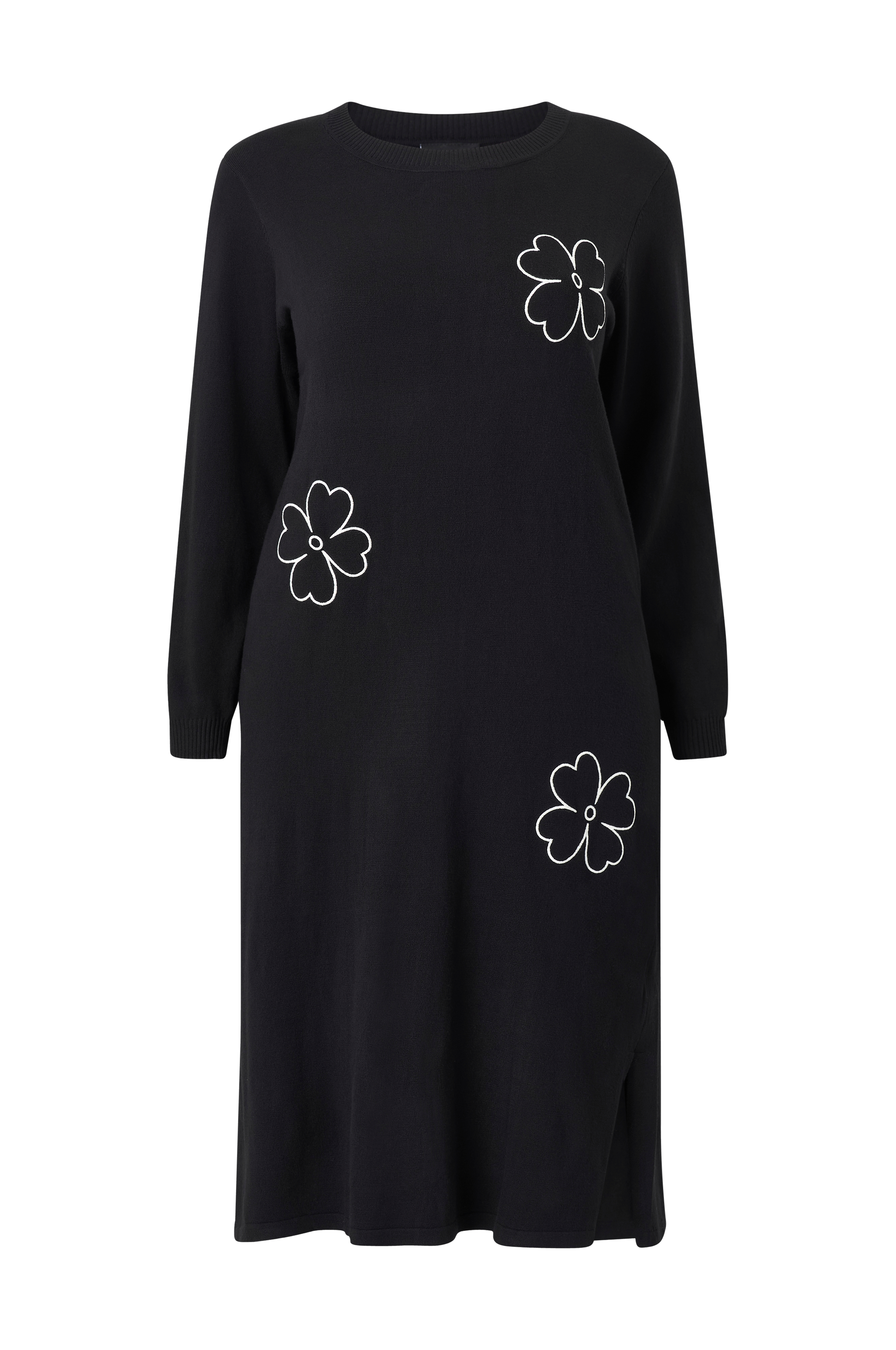• Kjole med broderede detaljer• Rund halsudskæring• Lange ærmer• Ribstrik rundt om halsudskæringen og ved manchetterne• Slids nede i siderne• Plusstørrelser• Længde: 120 cm i størrelse S