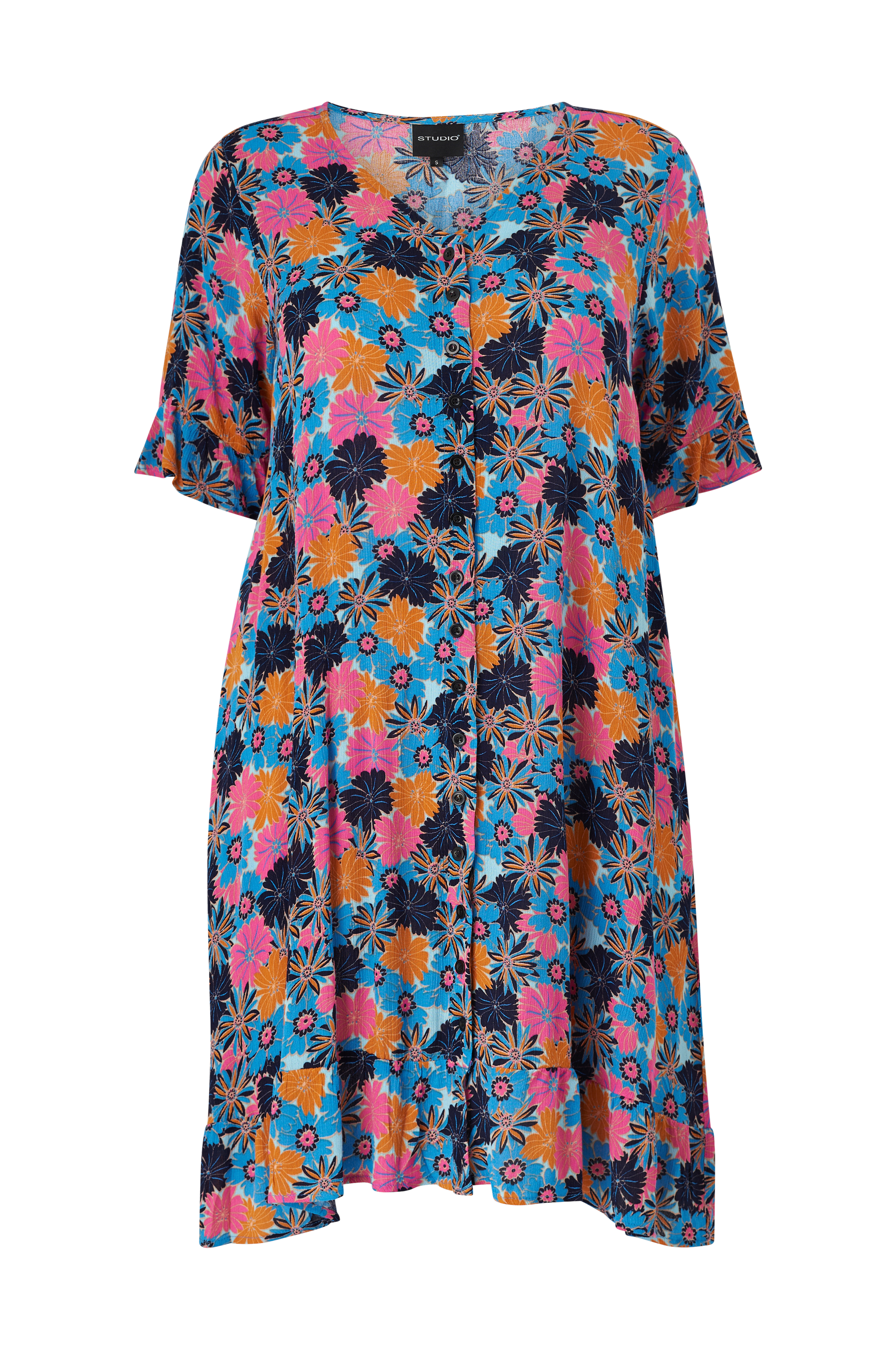• Store størrelser• Model med svaj i crepe• V-formet halsudskæring• Knapper hele vejen frem• Kort ærme med lille volant ved manchetterne• Længde: 102 cm i størrelse S