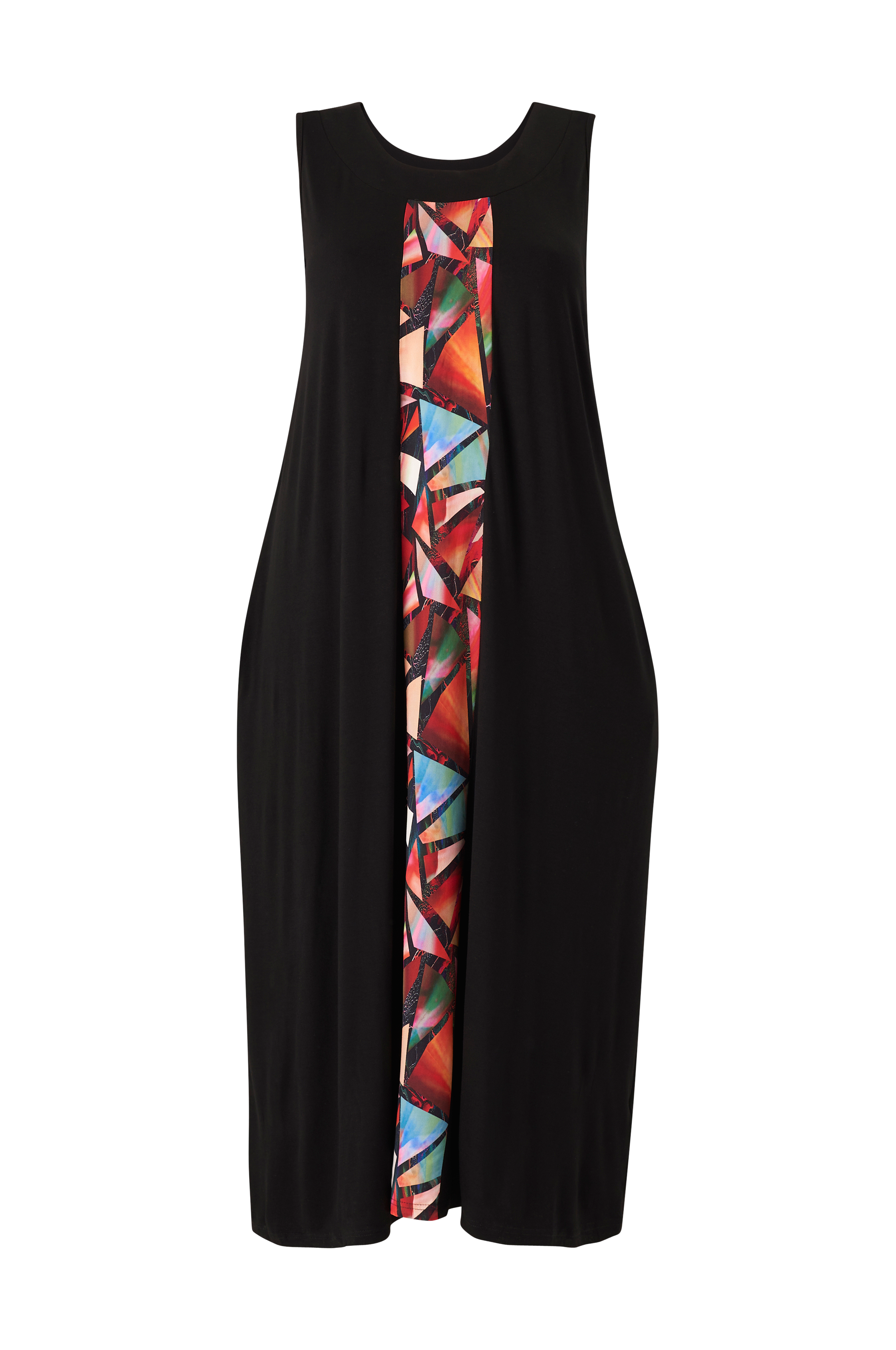 • Lang, ærmeløs kjole i viskosejersey• Mønstret panel foran• Lommer i siderne• Store størrelser• Længde: 133 cm i størrelse S