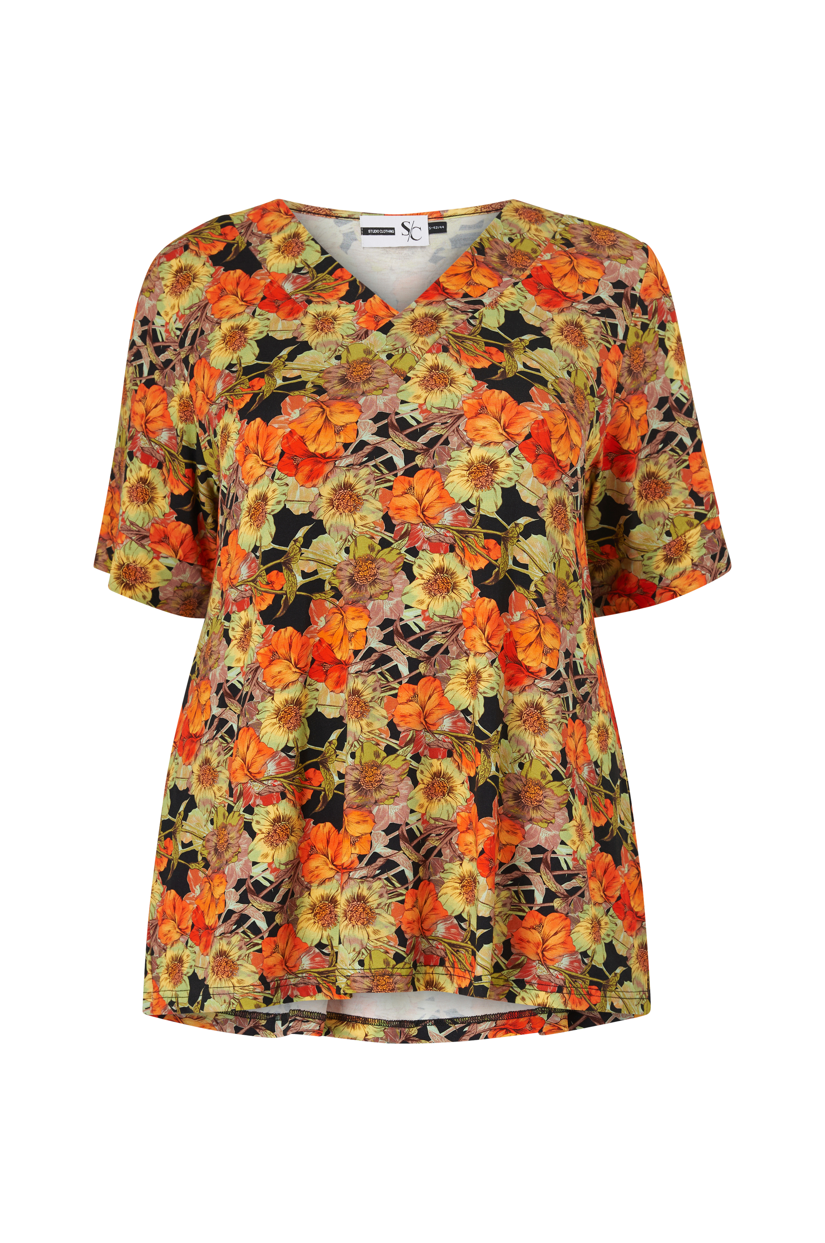 • Store størrelser• Lige model• Blød jersey• V-formet halsudskæring med bred kant• Kort ærme