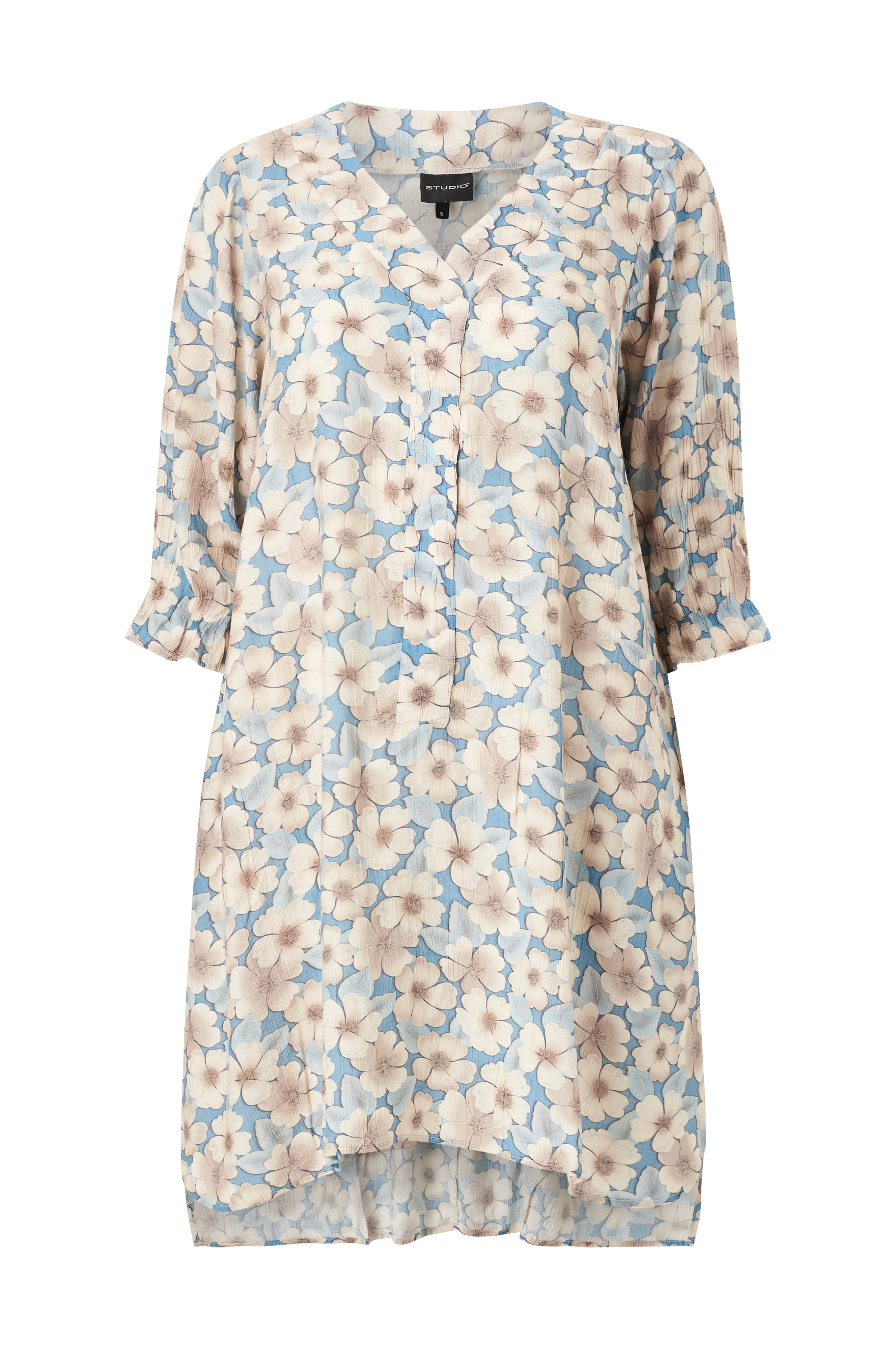 • Tunika med et blomstermønster• V-udskæring• 2/4 længdee ærmer• Elastik ved manchetterne• Sidelommer• Slids nede i siderne• Lidt længere bagside• Plusstørrelser• Længde: 114 cm i størrelse S