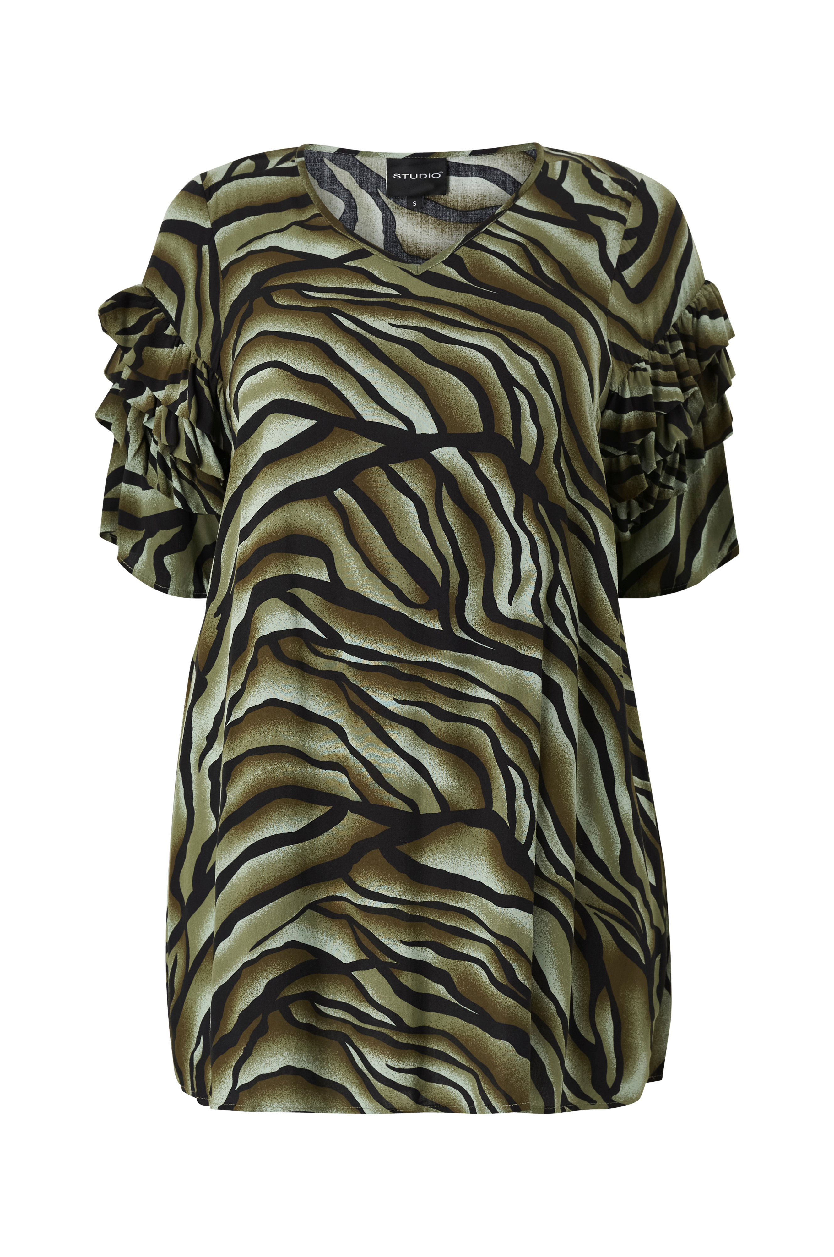 • Model med svaj• V-formet halsudskæring• Bredt, halvlangt ærme med volanter• Længde: 88 cm i størrelse S