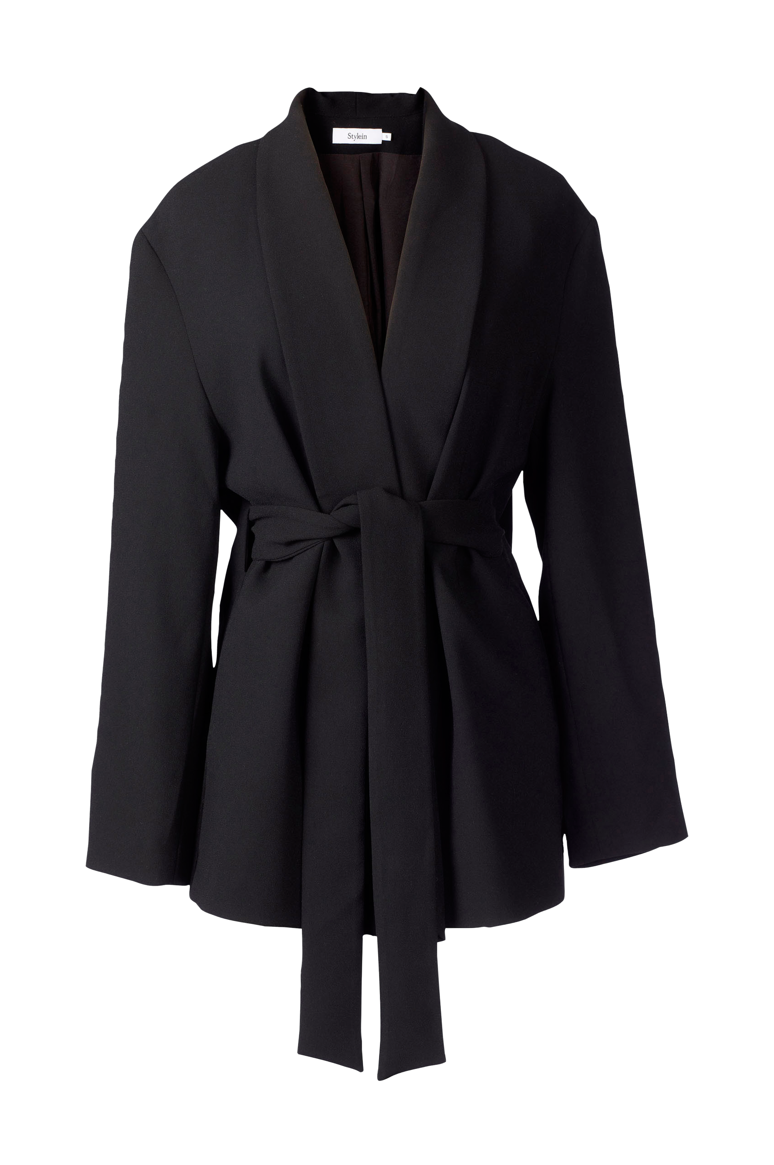 Helforet blazer i uldblanding med sjalskrave og let vattering i skuldrene. Lukning med bælte i taljen som giver den en feminin silhuet. Lommer i sidesømmene. Længde ca. 74 cm i str. S.