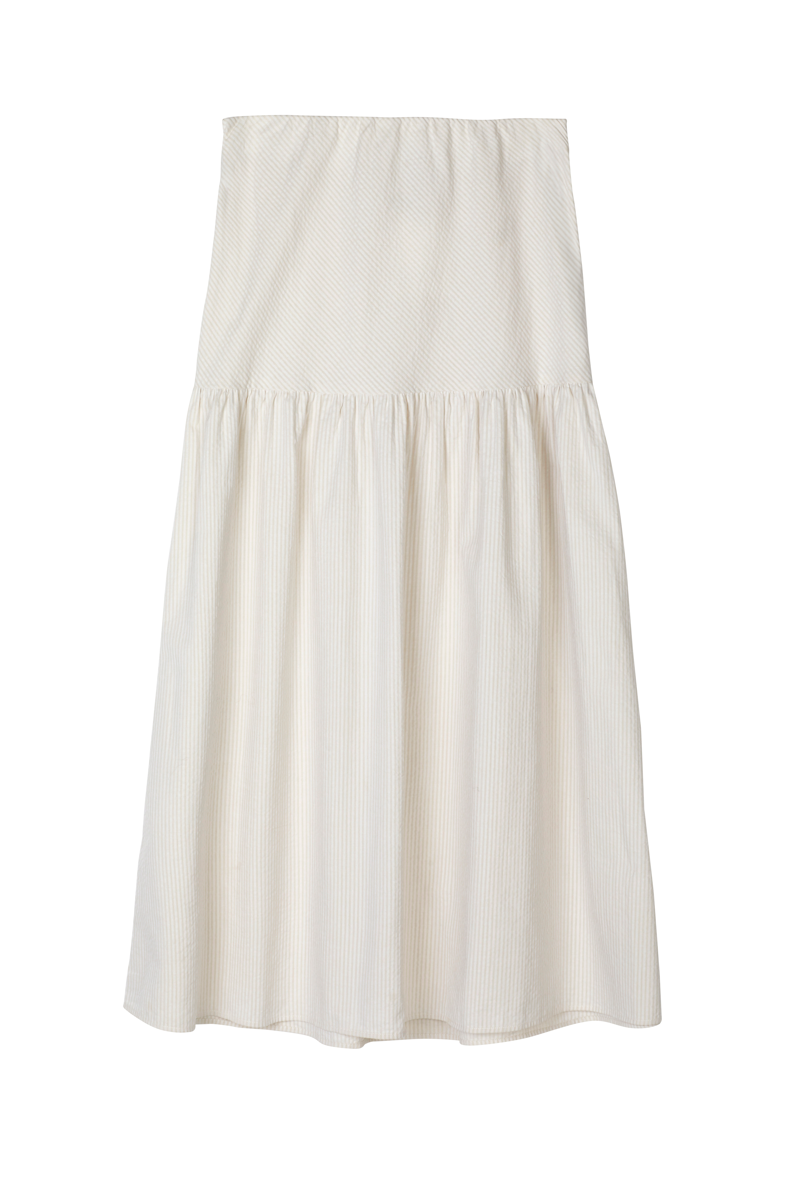 Denne nederdel er lavet af struktureret bomuldsseersucker og falder til ankelhøjde med en blød, flydende form. Den nederste del af nederdelen blusser ud og giver en struktureret, men alligevel flydende silhuet.