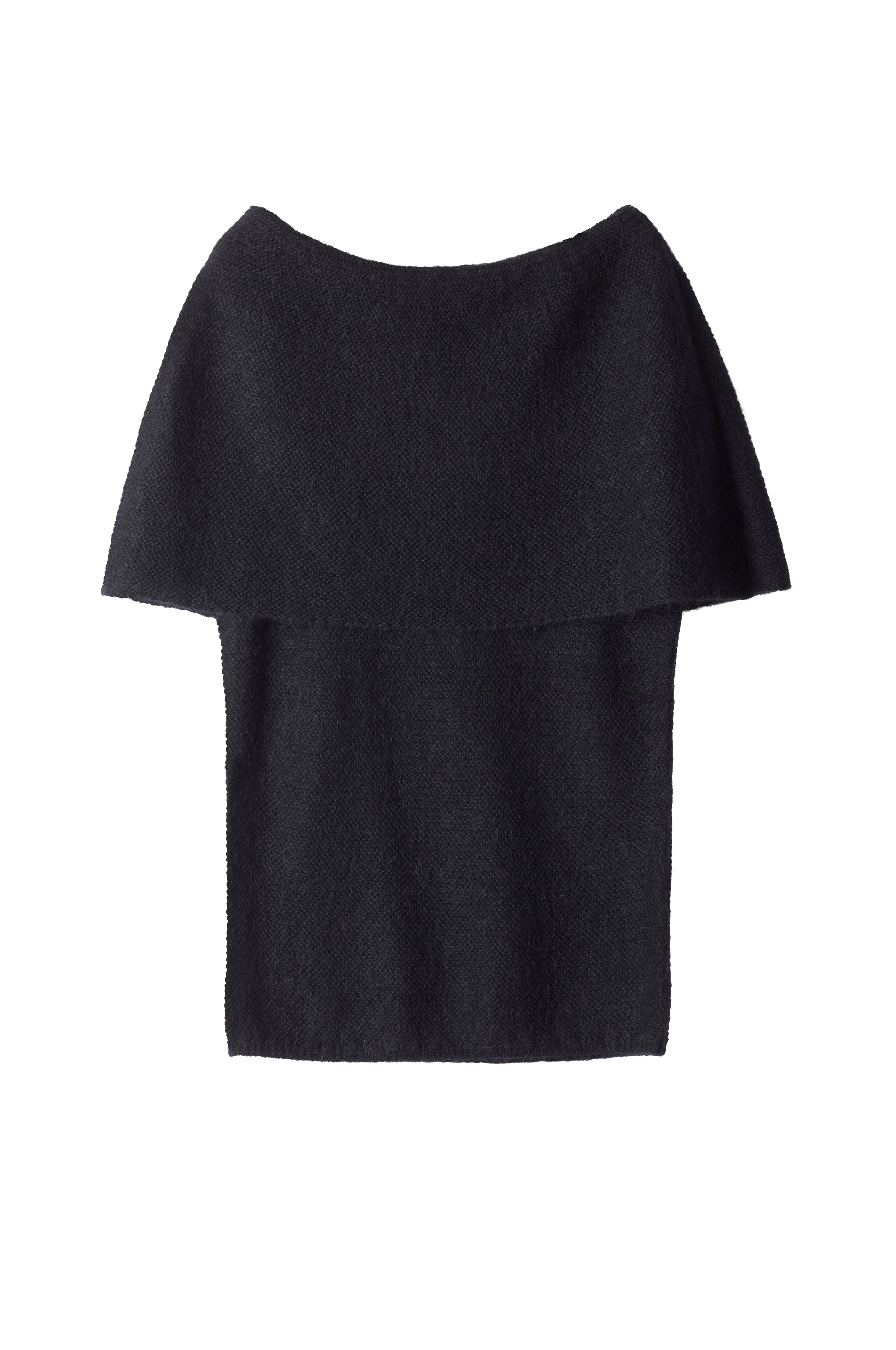 Dette er en unik strik fremstillet af en luksuriøs mohair-blanding. Dette ærmeløse design har en elegant kappedetalje, der er draperet over skuldrene og tilføjer et strejf af elegance. En elastisk tråd sikrer, at kraven forbliver perfekt på plads.