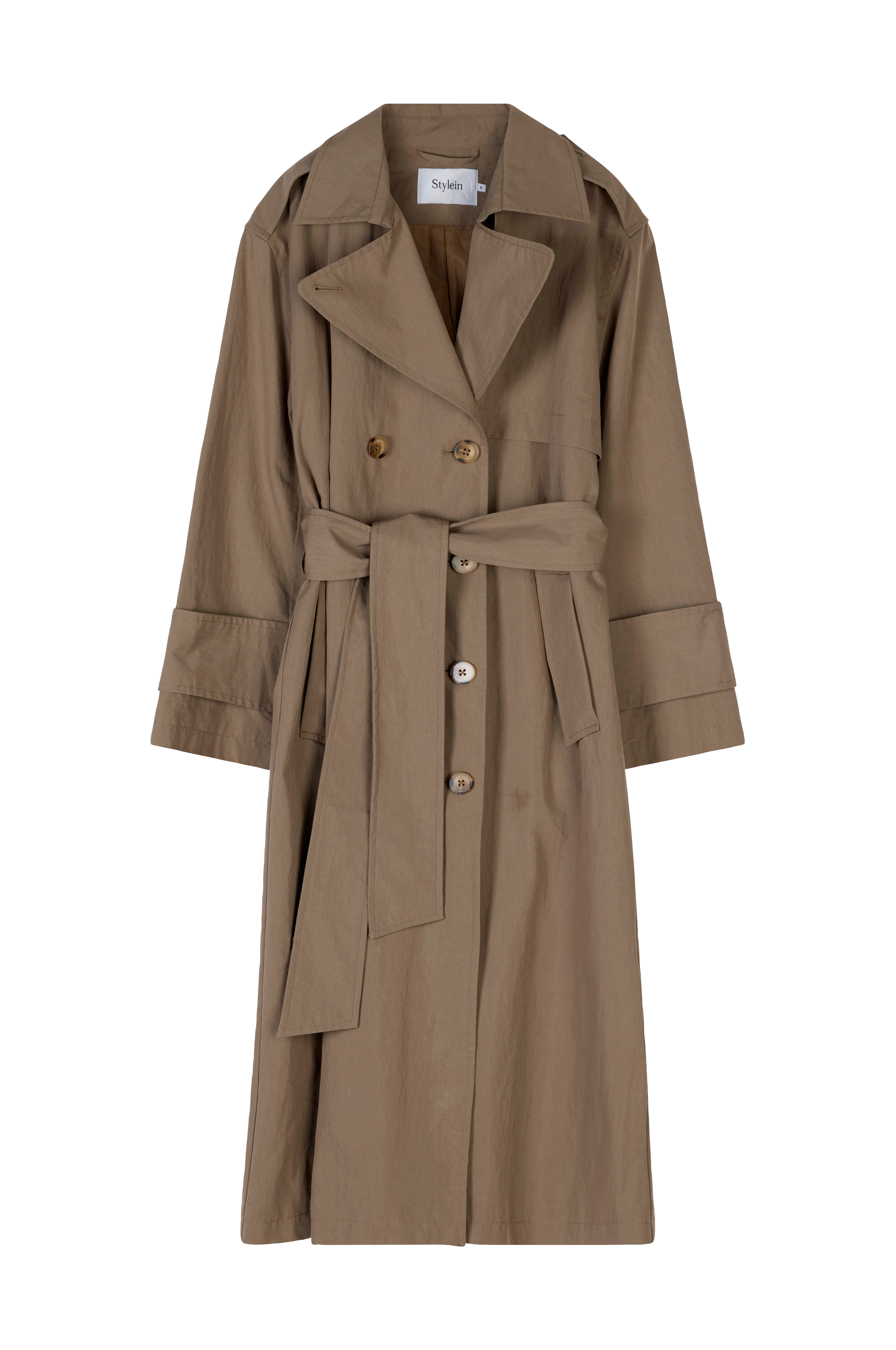 • Lang, dobbeltbrystet trenchcoat• Stropper på skuldrene og ved ærmeafslutningerne• Bindebælte ved taljen• Sidelommer• Slids nede bagved• Længde: 121 cm i størrelse S