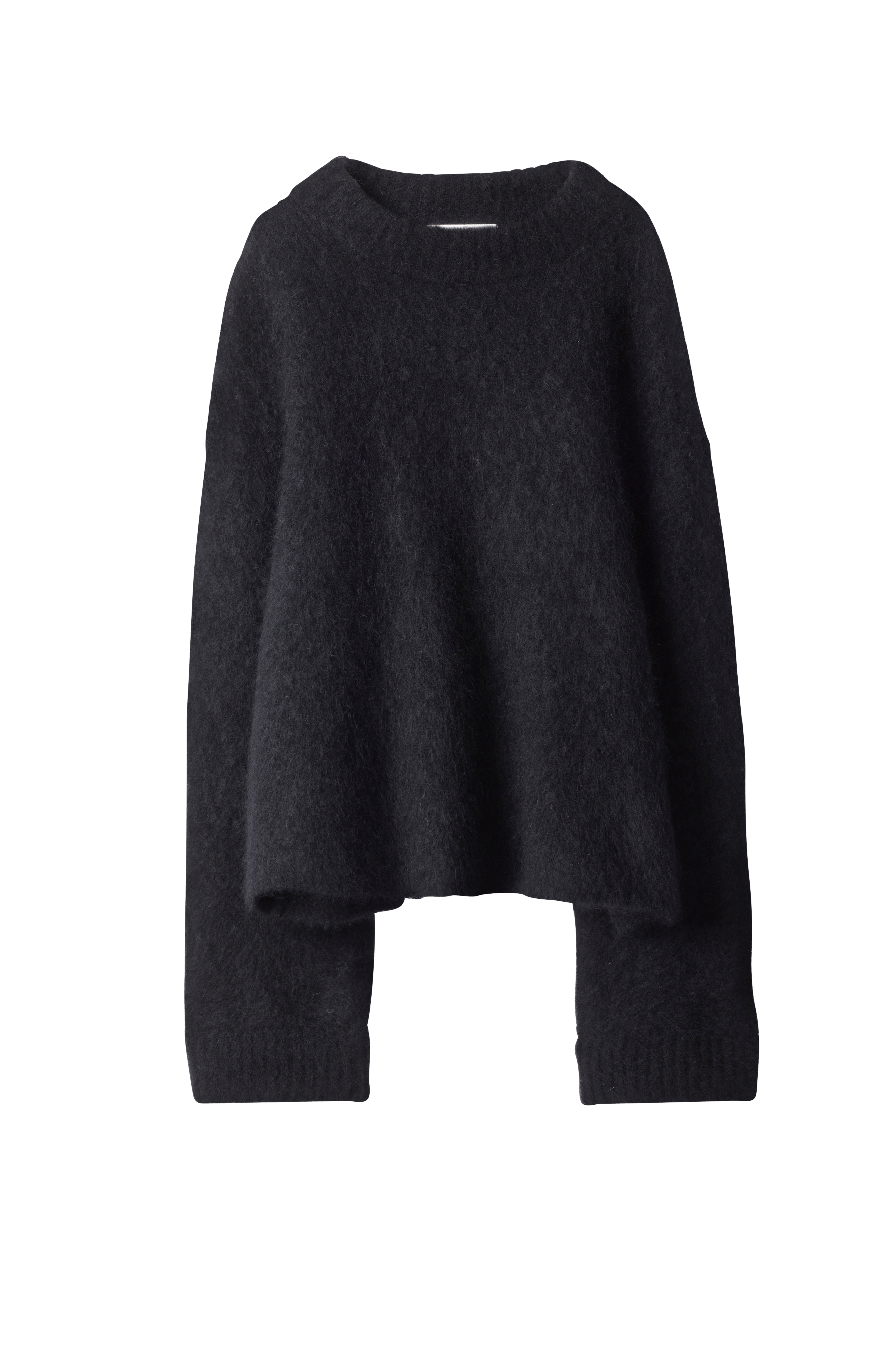 • Kort, bred model• Rund hals med ribstrik• Lige, bredt, ekstra langt ærme med bred ribkant ved ærmeafslutningerne