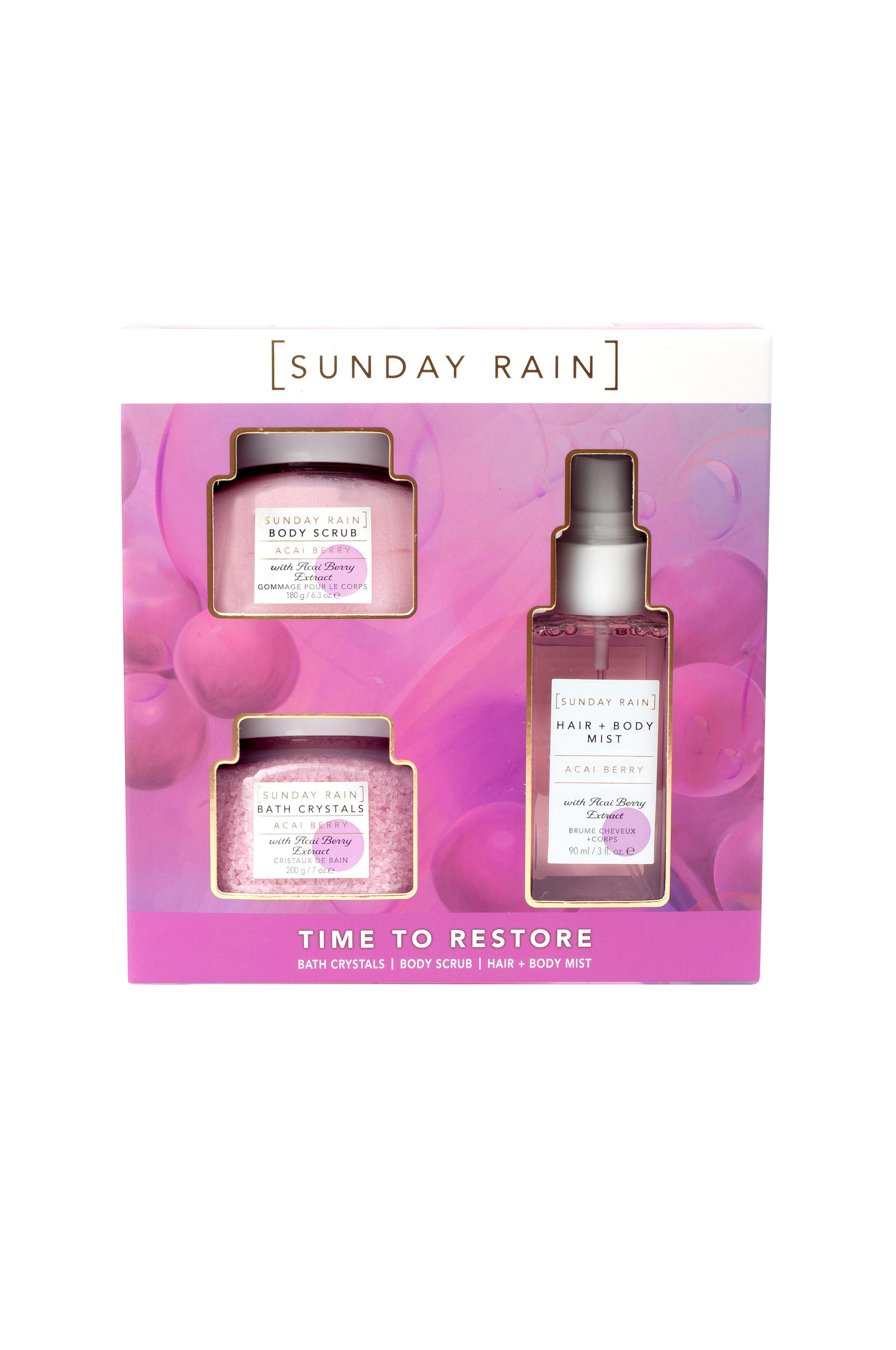 Start med et beroligende bad med vores acai berry duftende badekrystaller, polér derefter blidt din vej til glat hud med vores sukkerskrub, og slap til sidst af og genopret med vores frugtagtige hår- og kropsmist.