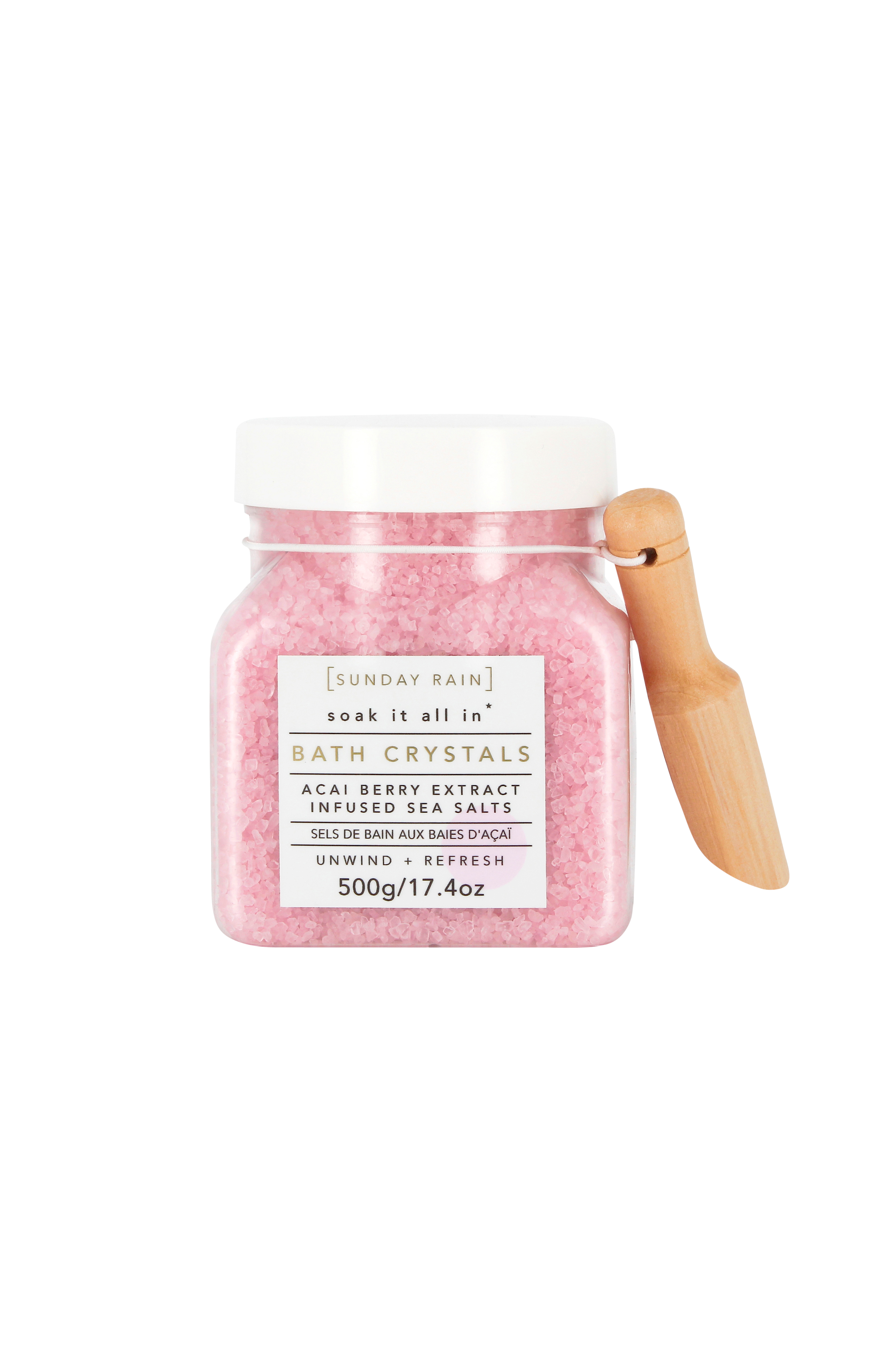 Badesalt til en luksuriøs hjemme-SPA-oplevelse. Fyldt med havsaltkrystaller, der dybderenser huden og acaibærekstrakt, der er rig på C-vitamin, som giver energi og udstråling.