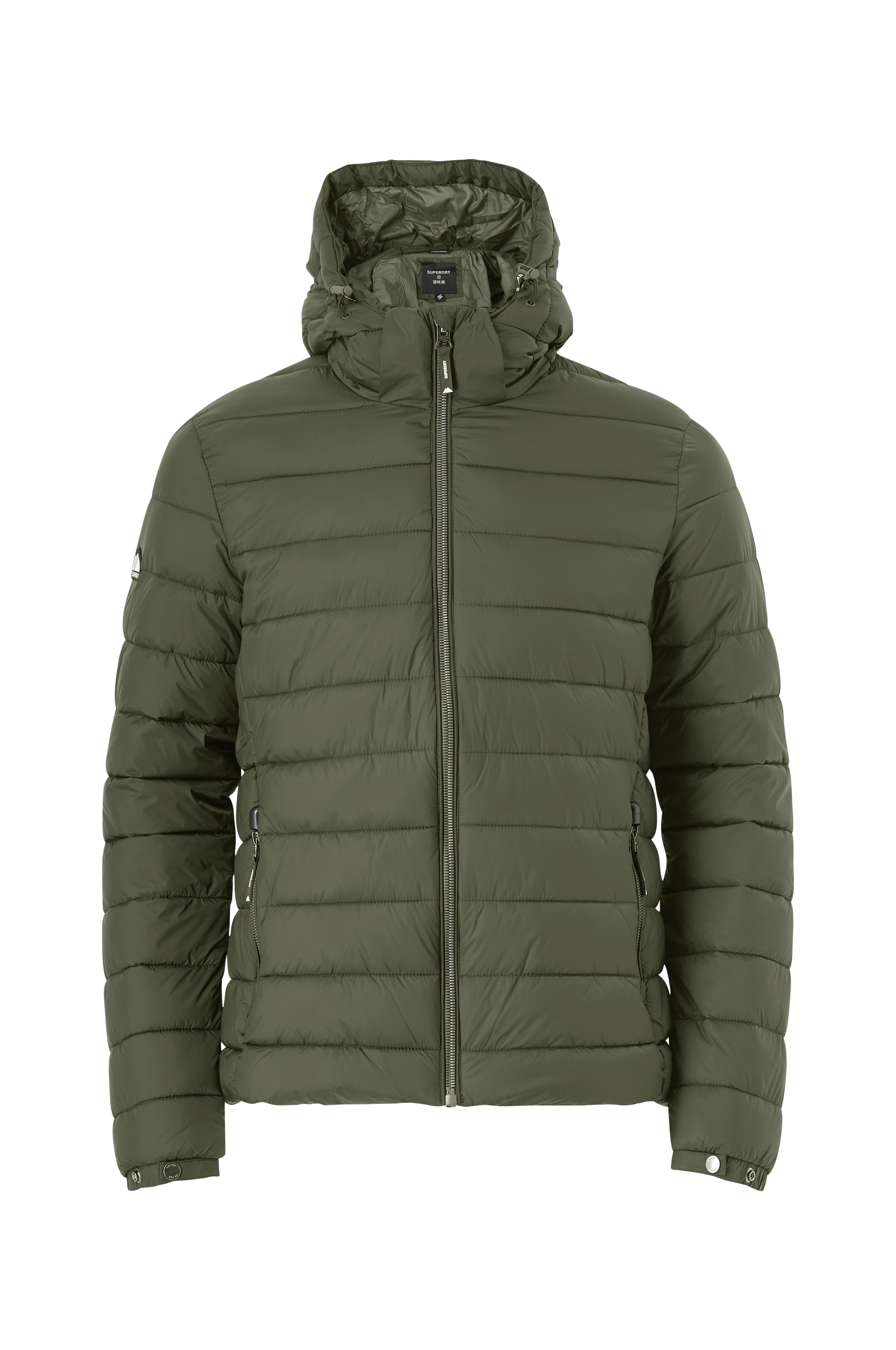 Vatteret og let dynejakke med aftagelig og justerbar hætte. Bag lynlåsen er der for som kan åbnes med lynlås. Elastiske, regulerbare ærmekanter. To lommer med lynlås. Løbegang med stop i kanten forneden. Længde ca. 70 cm i str. M.