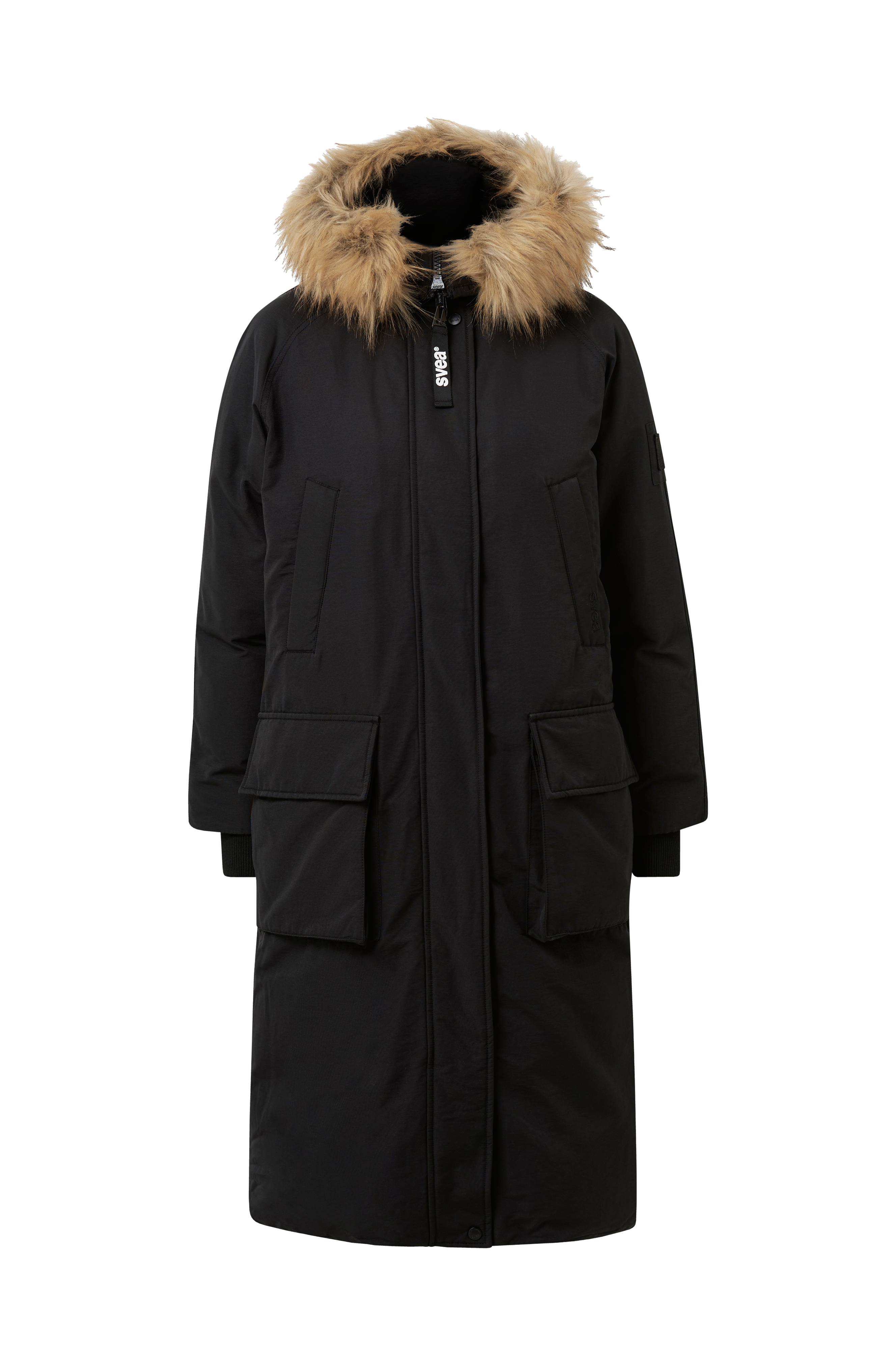Frakke W. Long Parka fra Svea i lang, vatteret model med hætte, som har aftagelig kant af kunstpels. Lynlås, som ikke går hele vejen ned foran, overfald med trykknapper og to store fleeceforede lommer med klap. Ribkant i ærmekant. Taljen er justerbar med indvendig løbegang. En inderlomme med lynlås. Længde ca. 112 cm i str. S.