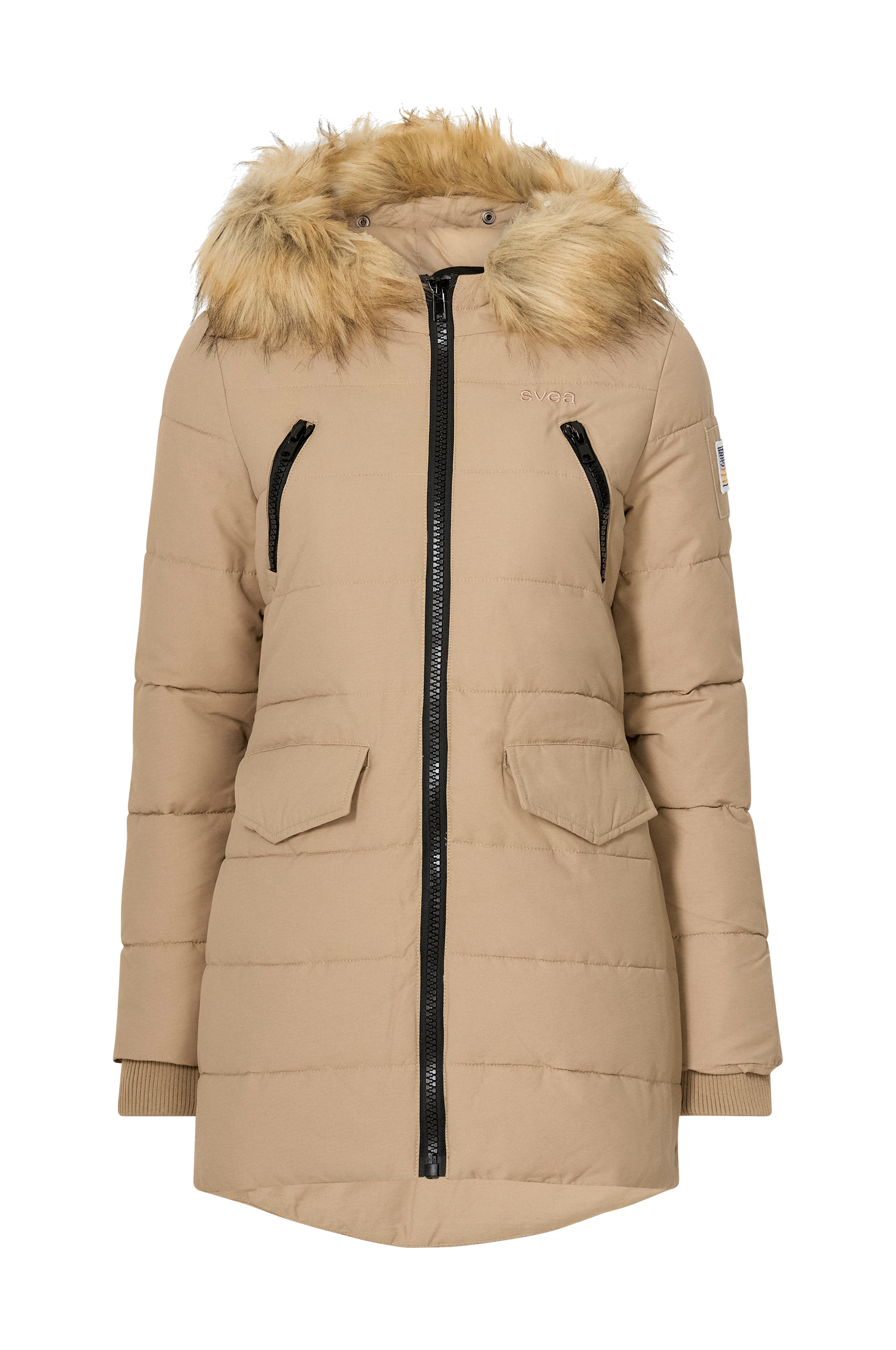 Jakke W. Joy Jacket fra Svea i slidstærk nylon- og bomuldsblanding med varmende vattering. Mellemlang model med lynlås og fire fleeceforede lommer foran, ribkant i ærmekant og justerbar talje med indvendig løbegang. Fast hætte med aftagelig kant i kunstpels. Længde ca. 78 cm i str. S.