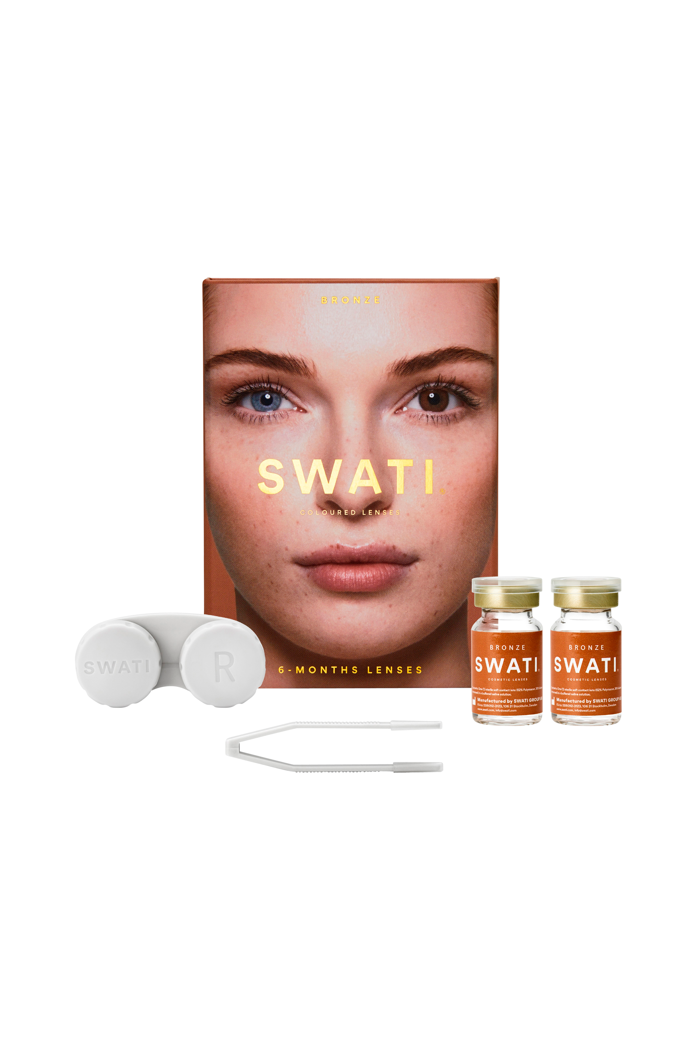 1 box med 6-måneders linser, farvede kosmetiske linser levereres med 2 linser, linse-etui og pincet.