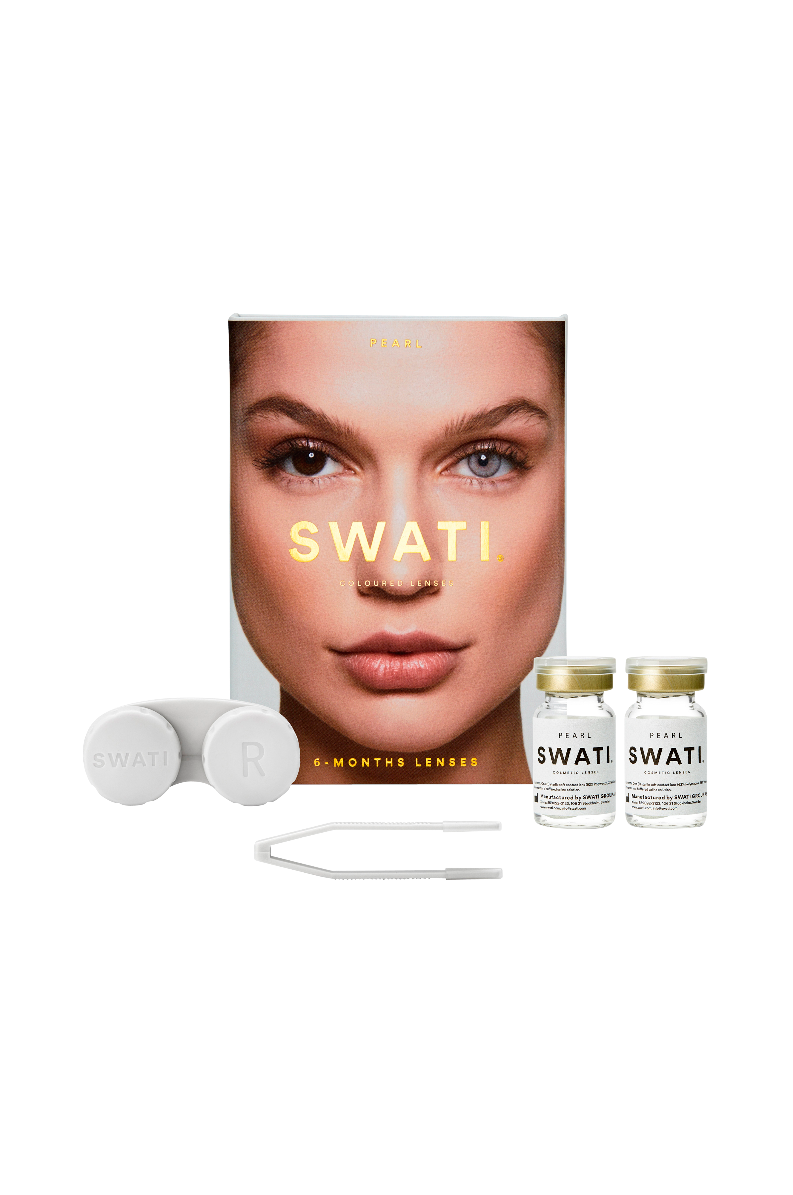 1 box med 6-måneders linser, farvede kosmetiske linser levereres med 2 linser, linse-etui og pincet.